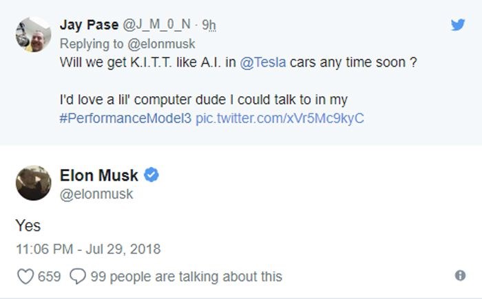Twitter’da bir kullanıcısının „Yakında Tesla otomobillerde K.I.T.T gibi bir yapay zekaya sahip asistanımız olacak mı?“ sorusuna Musk „Evet“ yanıtını verdi.