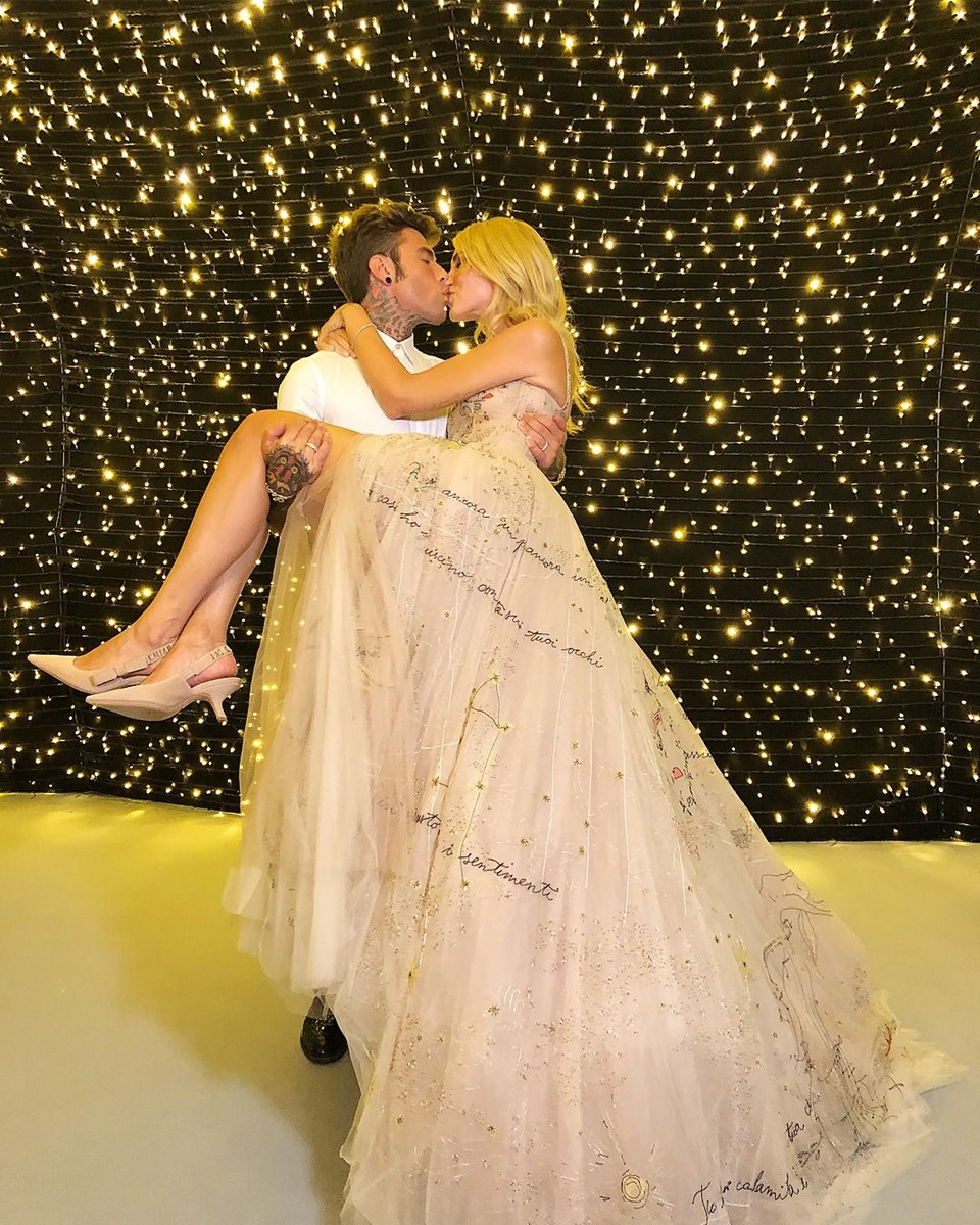 31 yaşındaki ünlü moda tasarımcısı ve model, Fedez’in kendisi için yazdığı şarkının sözlerinin yer aldığı elbisede, ikili için özel anlam ifade eden simgeleri de kullandı.