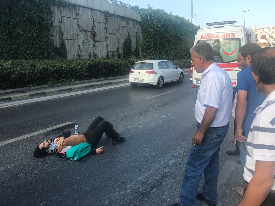 Kendisine sorular sonra kişiye, “Şu an yerde yatar vaziyetteyim. Sizi çok sağlıklı bilgiler veremeyebilirim. Kaza yaptım ama ben tam dönerken bir araç bizi sıkıştırdı. İnsanların söylediği ve bende bunu hissettim. Freni basınca kayıp düştüm. Böyle bir kaza meydana geldi, hızımız düşüktü. Sigortam var ama kaskom yok” dedi.