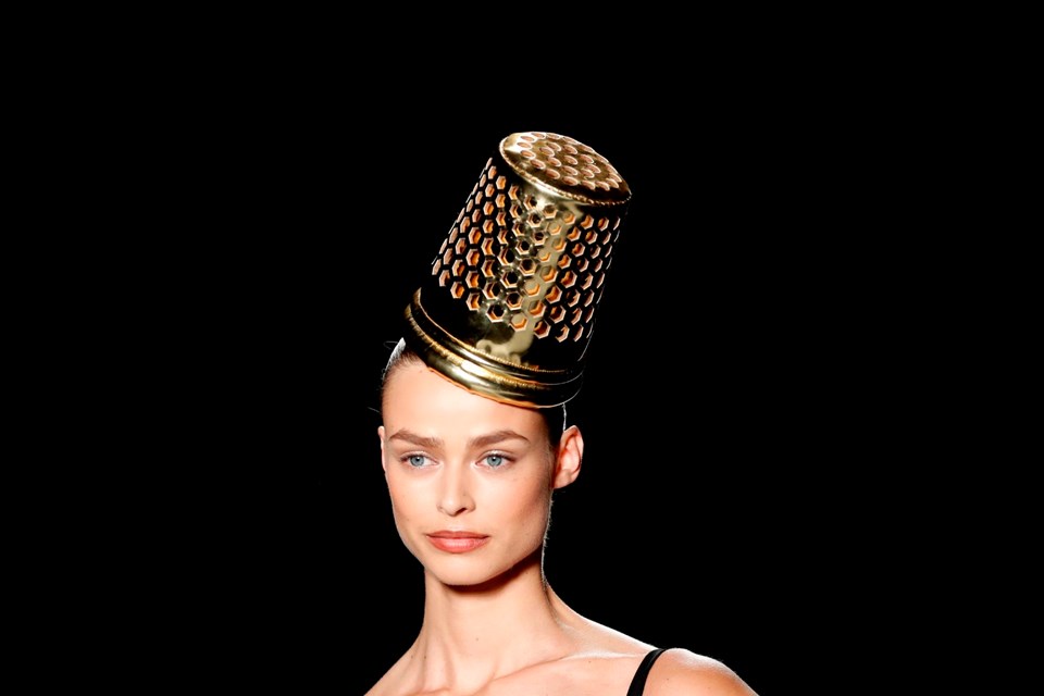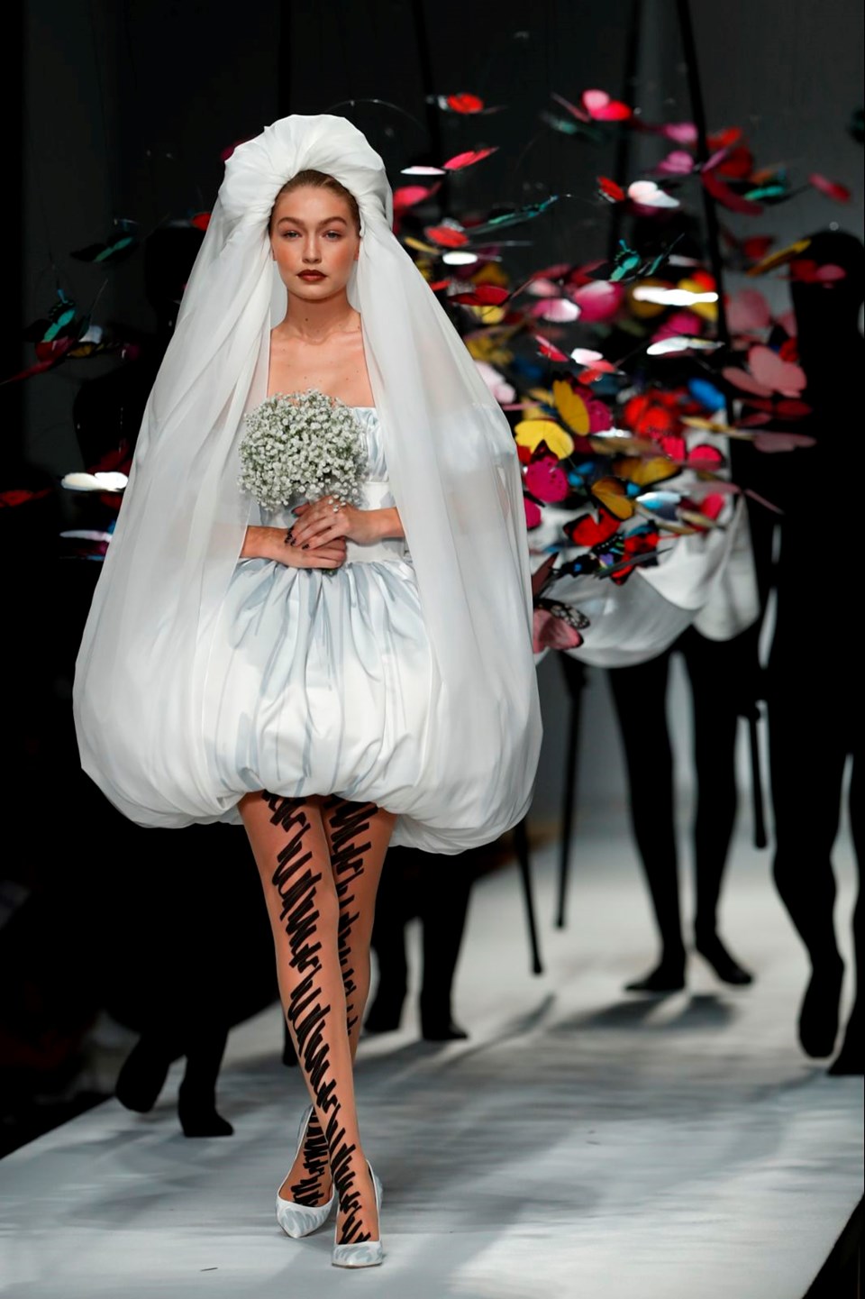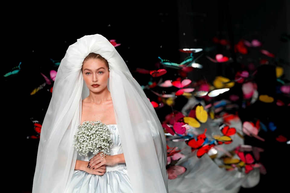 Defilenin baş mankeni Gigi Hadid, etekleri yarım olan kabarık bir gelinlik giydi.