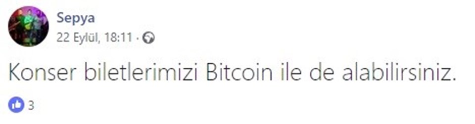Sepya‘ müzik grubu, sosyal medya üzerinden, hem organizatörlerden hem de dinleyicilerden Bitcoin ile ödeme alınabileceğini duyurdu.