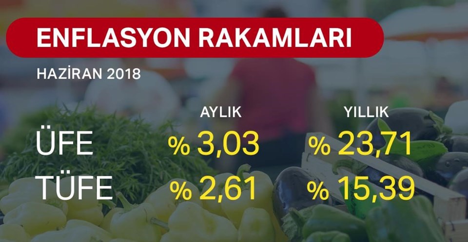 TÜİK, haziran ayı enflasyon verilerini açıkladı. TÜFE’de (2003=100) 2018 yılı Haziran ayında bir önceki aya göre yüzde 2,61, bir önceki yılın Aralık ayına göre yüzde 9,17, bir önceki yılın aynı ayına göre yüzde 15,39 ve on iki aylık ortalamalara göre yüzde 11,49 artış gerçekleşti.