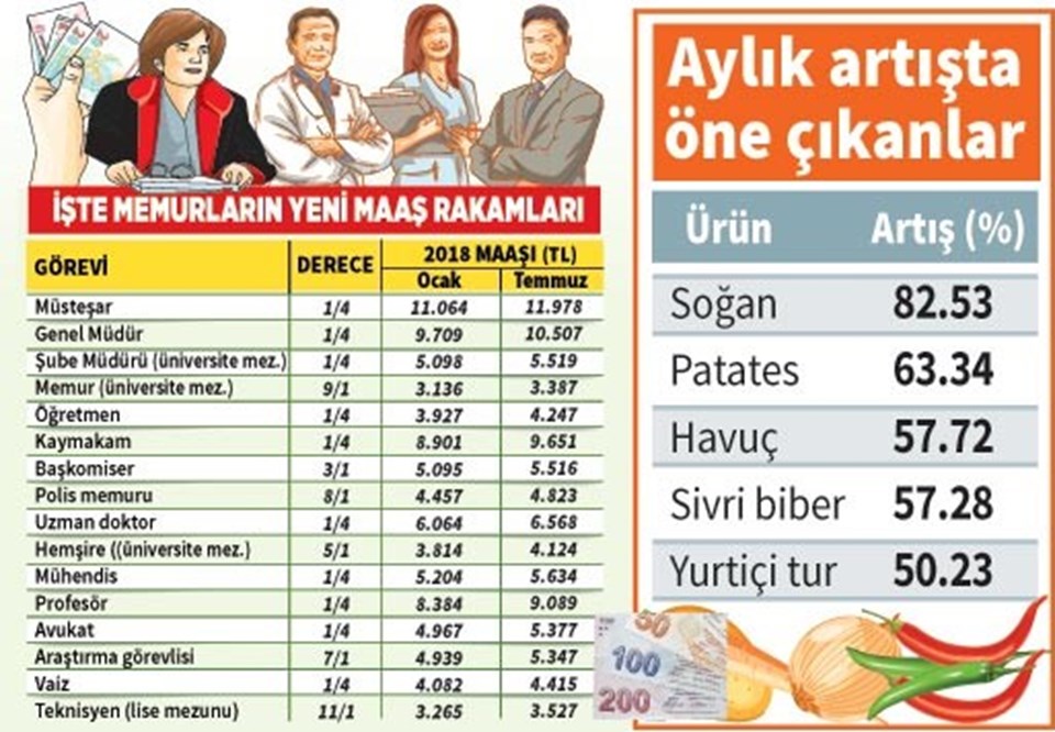 Haziran enflasyonu sonrası, yılın ikinci yarı zamları belli oldu. Maliye Bakanlığı, Türkiye’de en düşük memur maaşının aylık 2,893 TL’den 3,133 TL’ye yükseltildiğini açıkladı. En düşük memur emekli aylığı da 1,978 TL’den 2,149 TL’ye yükseldi. İlave enflasyon farkıyla birlikte kamu görevlileri ile memur emeklilerinin aylıklarına toplamda yüzde 8,65 zam yapıldı. Aynı dönemde SSK ve Bağ-Kur emekli aylıklarında ise yüzde 9,17 oranında artış sağlandığı bildirildi.