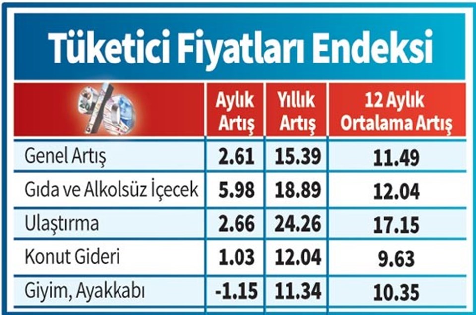 Tüketici fiyat endeksi (TÜFE) ise haziranda; -Bir önceki aya göre %2,61, – Bir önceki yılın aynı ayına göre %15,39, – 12 aylık ortalamaya göre %11,49 arttı.