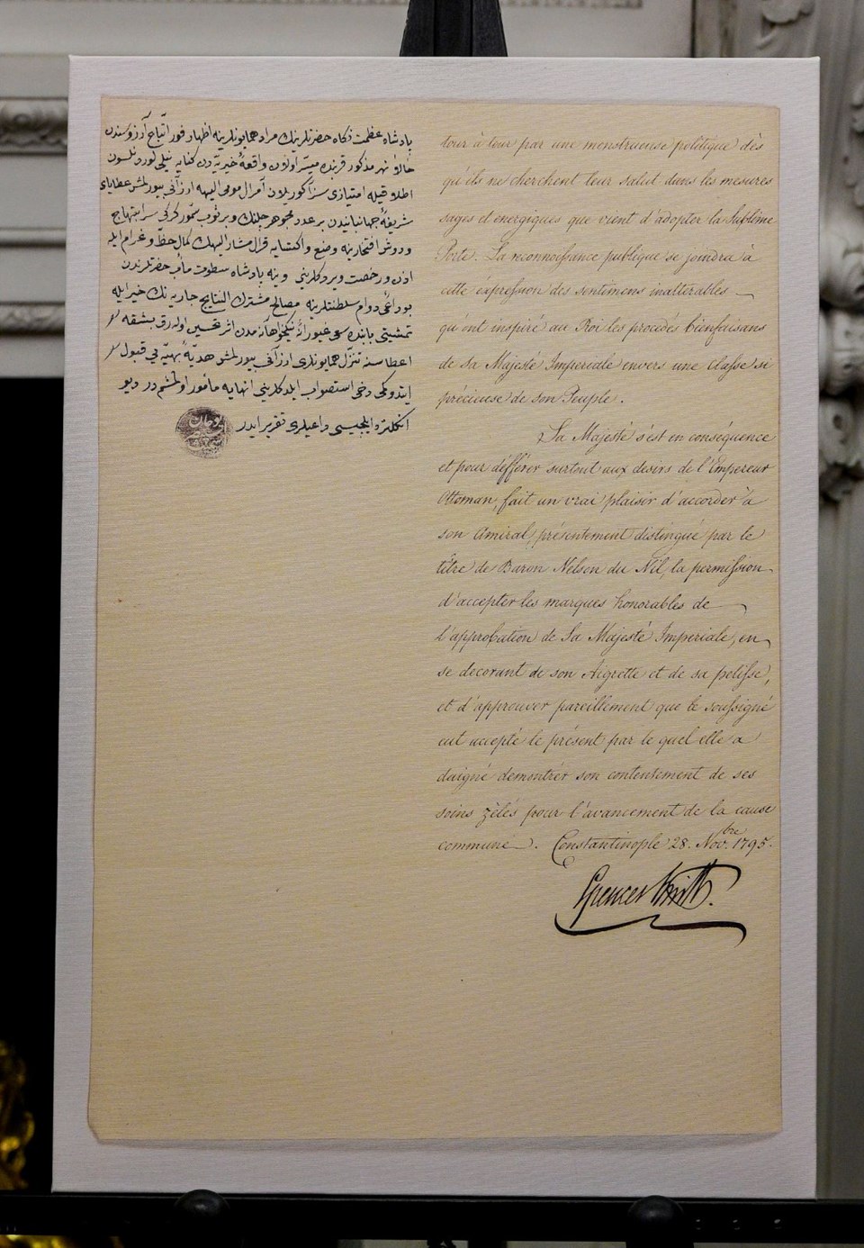Tarihin tozlu sayfalarını günümüze taşıyan sergide Amiral Nelson’a padişah tarafından hediye edilen ve 13 elmas okun yer aldığı yaklaşık 300 adet elmasa sahip çelenk, 1789 yılında olan Nil Savaşı sırasında batırılan 13 Fransız gemisini sembolize ediyor.