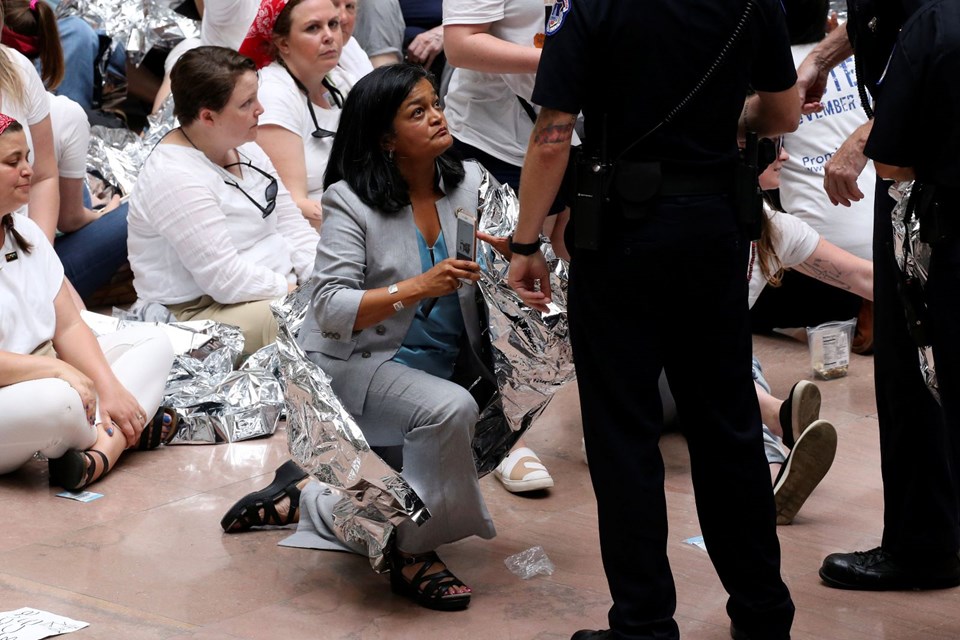ABD Başkanı Trump’ın sıfır tolerans kararını protesto eden yüzlerce kişi Washington’daki Senato binasında toplandı. Aralarında ABD’li oyuncu Susan Sarandon ve Temsilciler Meclisi Üyesi Jayapal’ın da bulunduğu 575 kadın gözaltına alındı.