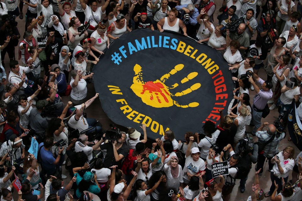 Göçmenlerin tutulduğu gözaltı merkezlerinin kapatılmasıı talep eden kadınlar üzerinde #FamiliesBelongTogether (Aileler birbirine aittir) etiketinin yazılı olduğu pankartlar taşıdı.