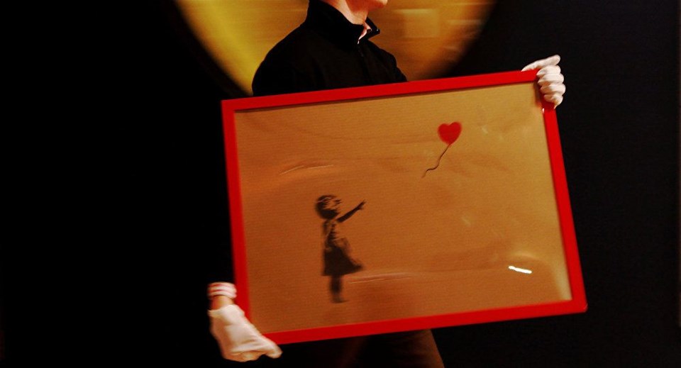 Banksy’nin „Balonlu Kız“ isimli eseri İngiltere’nin başkenti Londra’daki Sotheby’s Müzayede Evi’nde açık artırmaya çıkarıldı.
