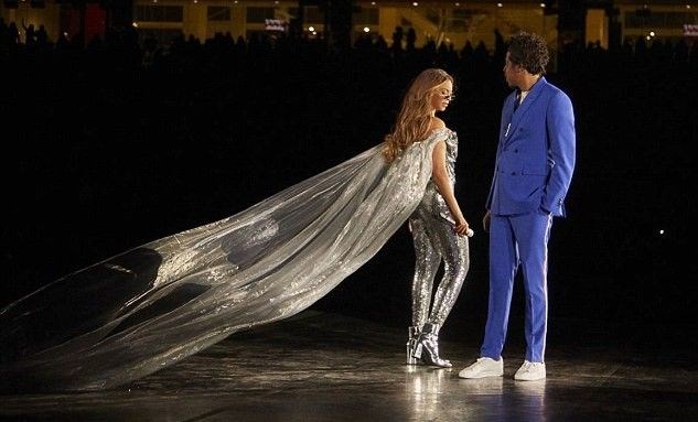Eşi Jay-Z ile birlikte sahneye çıkan Beyonce’ye eşi mavi renkli bir takım elbiseyle eşlik etti.
