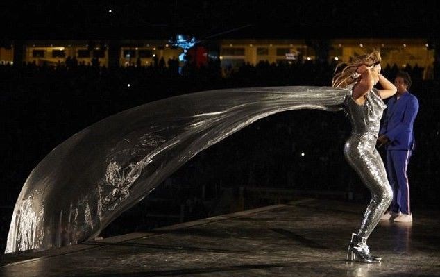 Metalik gri renkli tulumuyla sahnede parıl parıl parlayan şarkıcı Beyonce’ye pelerinine takılıp düşmemesi için asistanı yardım etti.