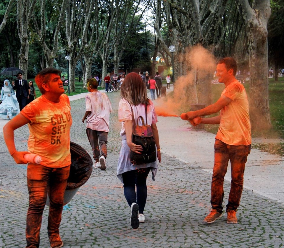 Katılımcıların üzerine, 5 kilometrelik parkurun belli noktalarındaki „renk istasyonları“nda, sarı, pembe, mor ve yeşil tozlar atıldı.