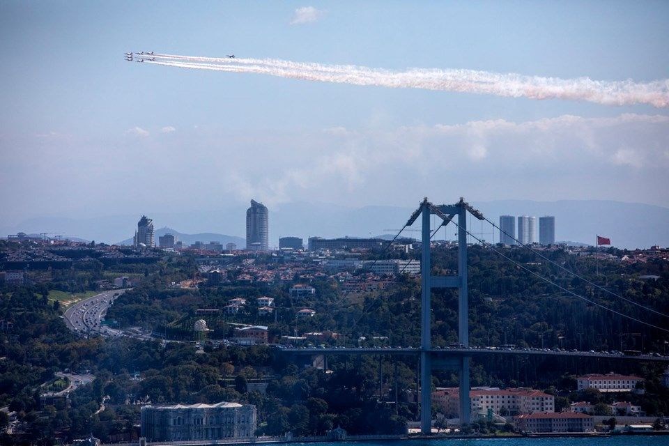 Yarın başlayacak TEKNOFEST İstanbul öncesinde Türk Yıldızları, İstanbul Boğazı’nda alçak uçuş gerçekleştirdi. Boğaz boyunca kıyılara akın eden vatandaşlar, gösteriyi cep telefonları ve kameralarıyla kaydetti.