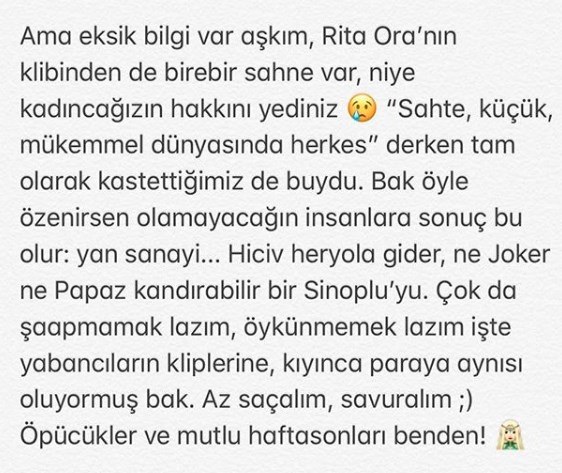 Derici iddiaların ardından şu açıklamayı yaptı: „Eksik bir bilgi var aşkım, Rita Ora’nın klibinden de birebir sahne var, niye kadıncağızın hakkını yediniz. „Sahne, küçük, mükemmel dünyasında herkes“ derken tam olarak kastettiğimiz de buydu. Bak öyle özenirsen olamayacağın insanlara sonuç bu olur: Yan sanayi… Hiciv her yola gider, ne Jojer ne Papaz kandırabilir bir Sinoplu’yu. Çok da şaapmamak lazım, öykünmemek lazım işte yabancıların kliplerine, kıyınca paraya aynısı oluyormuş bak. Az saçalım, savuralım. „