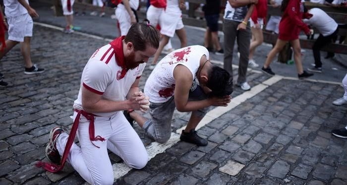 DUA İLE BAŞLIYORLARKoşu öncesi katılımcılar hazırlık yapıyor. Bu iki adam, kentin koruyucusu olduğuna inanılan Fermin (San Fermin) için dua ediyorlar. Geleneksel olarak koşu başlamadan önce “A San Fermin Pedimos” şarkısı söyleniyor. Koşu üç dakika sürüyor ve boğa güreşi ile sonlanıyor. Mesafe 825 metre.