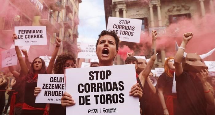 BOĞA GÜREŞİ KÜLTÜRÜNE KARŞIBoğa güreşini protesto eden hayvan hakları aktivistleri, festivalin başlamasından önce bu yıl yine bir araya geldi. „Peta“ ve „Animal Naturalis“ gibi örgütlerin aktivistleri belediye binası önünde boğa güreşlerinin durdurulması çağrısı yaptı. Kırmızı işaret fişeği boğaların kanını temsil ediyor. Bu geleneksel etkinliklerde her yıl binlerce boğa ölüyor.