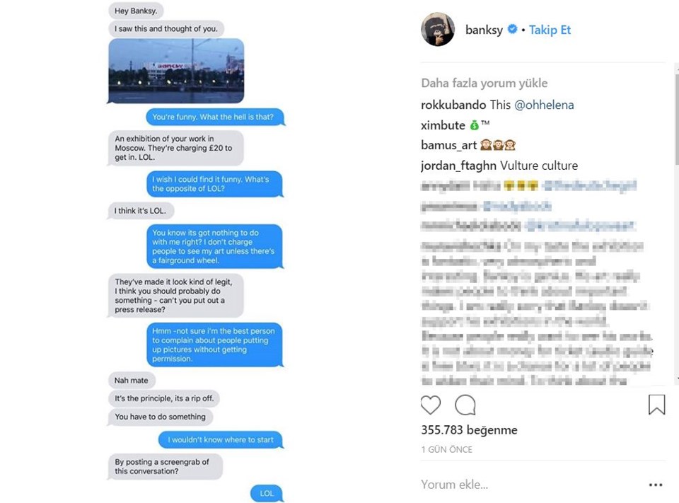 Kimliğini gizli tutan İngiliz sokak sanatçısı Banksy adına Moskova’da bir sergi açıldı. Halen devam eden sergiyi Banksy’ye bir hayranı resmi Instagram sayfasına mesaj atarak haber verdi. Sanatçı cevabında 2 Haziran’da açılan sergiyi ilk kez duyduğunu söyledi. İzleyici sonraki mesajında Banksy’ye serginin VIP turunun 20 dolar, girişinse 10 dolar olduğunu yazdı.