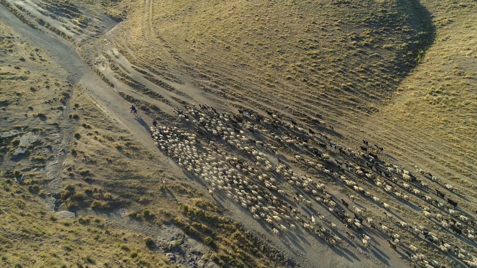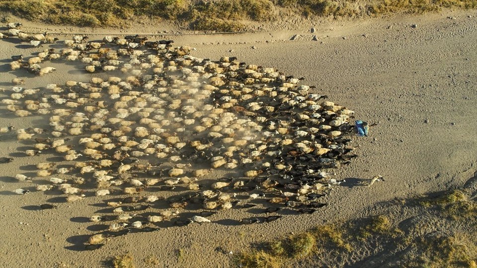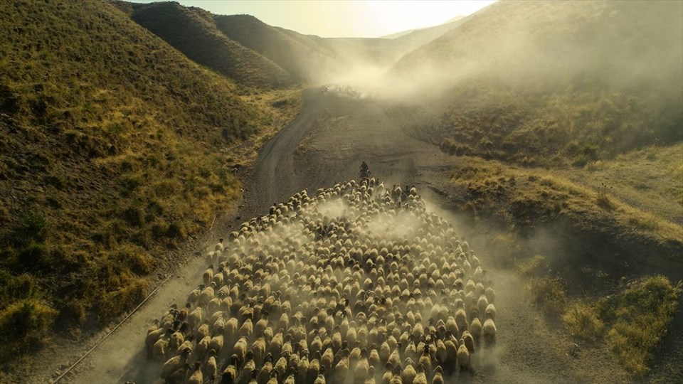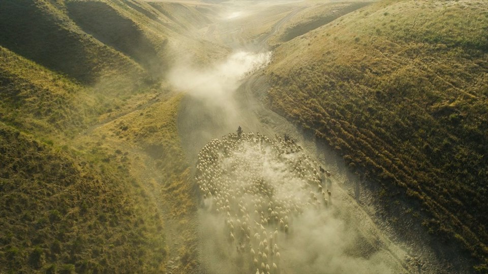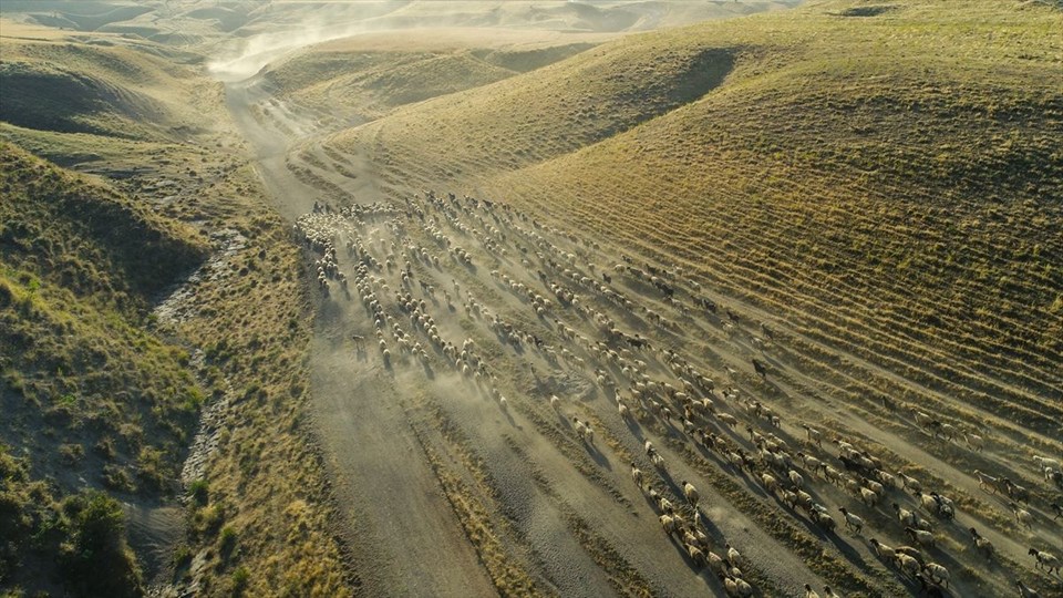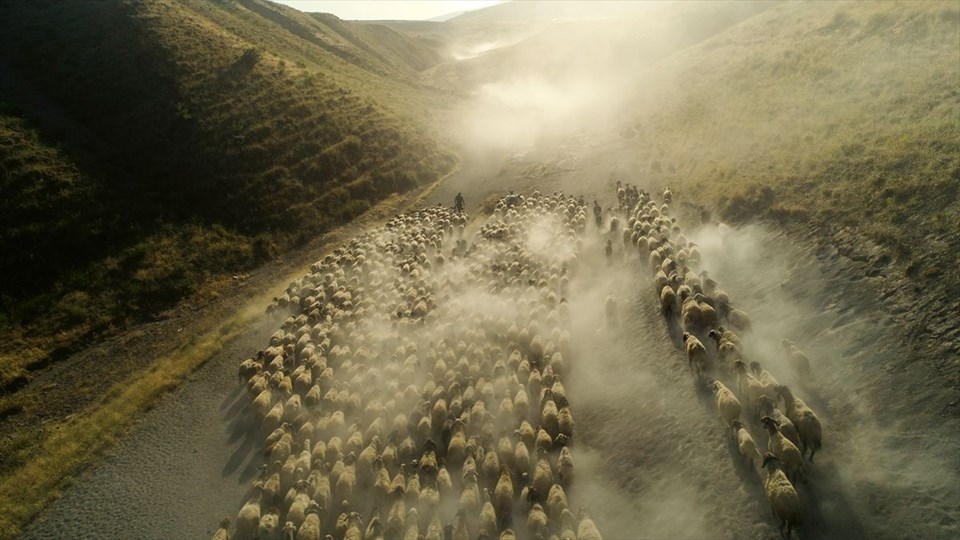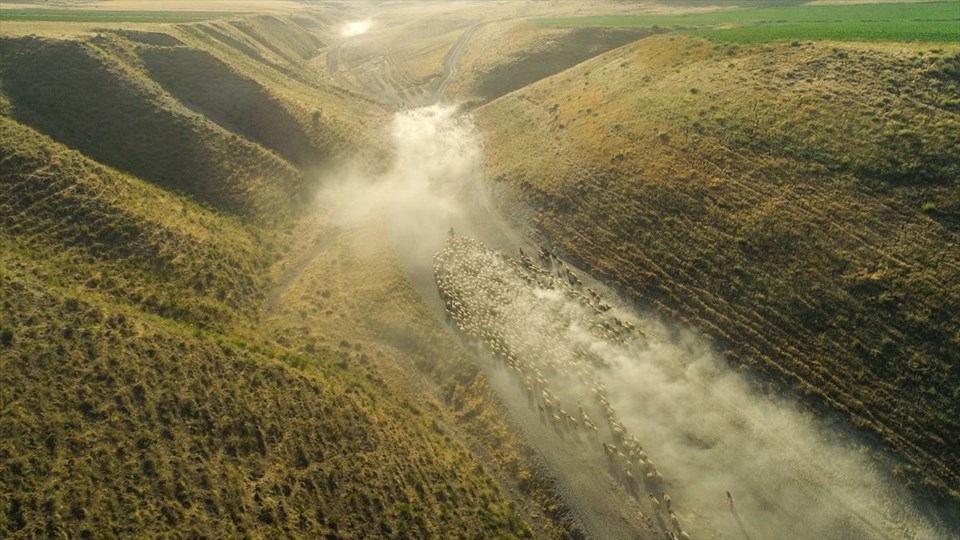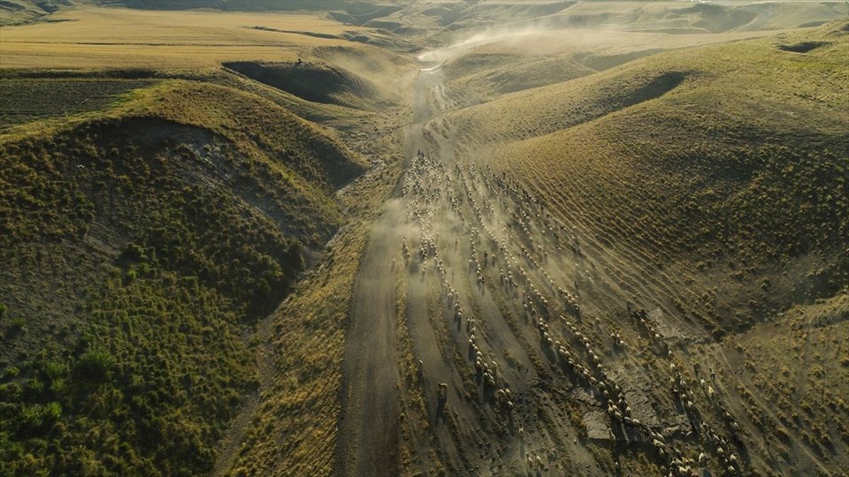 Gün batımına doğru kızıl bir renge bürünen vadiler eşsiz görüntüler sunuyor. Sürülerin gün batımındaki tozlu yolculuğu drone ile görüntülendi. İşte diğer kareler…