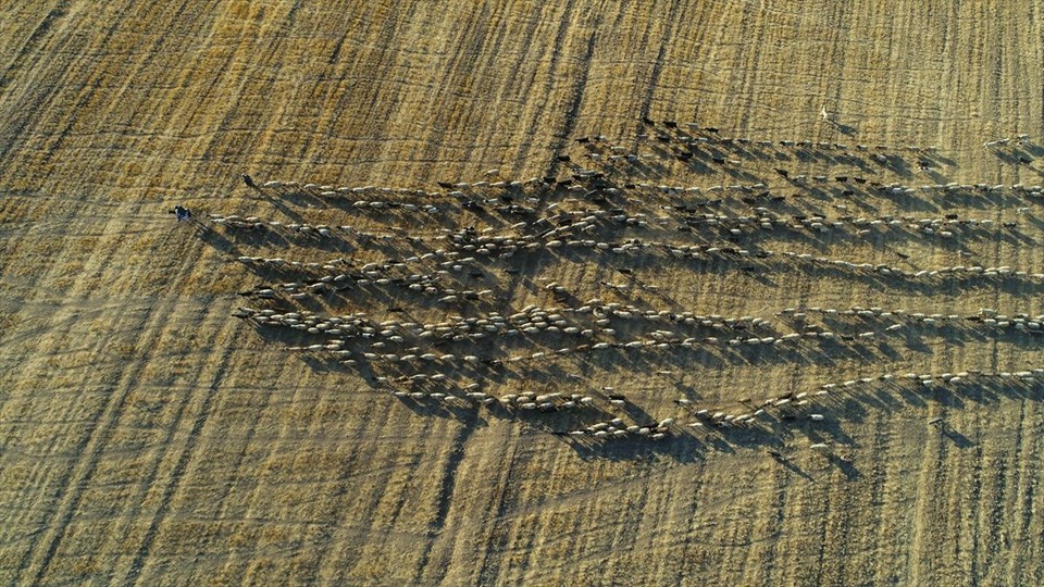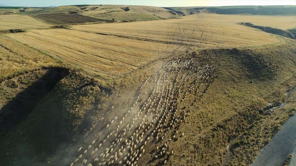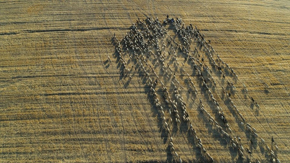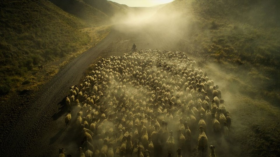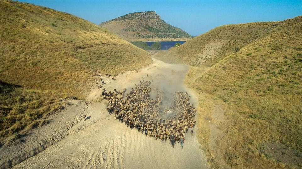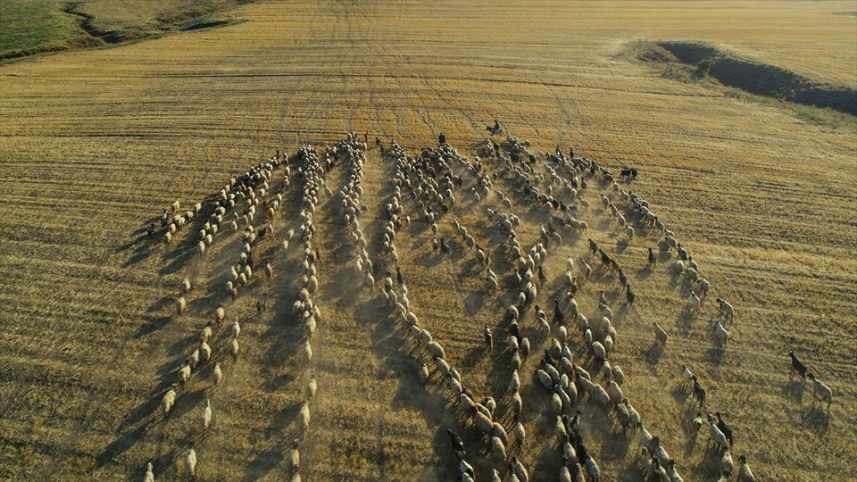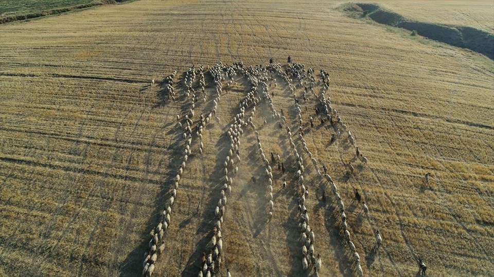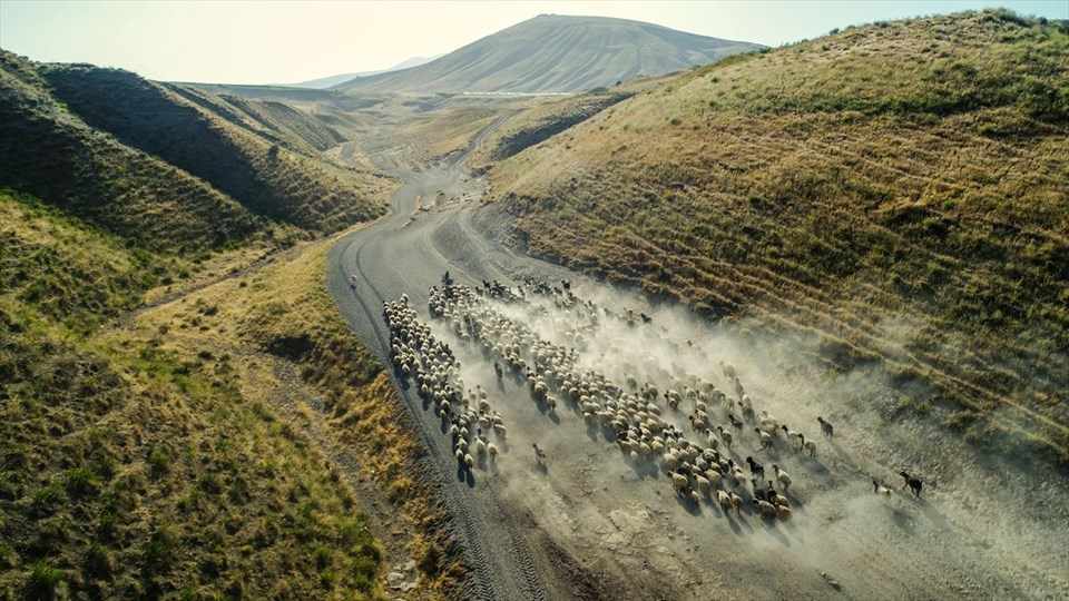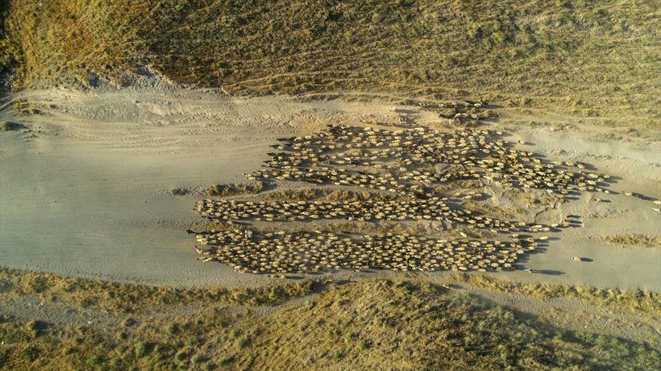 Gün batımına doğru kızıl bir renge bürünen vadiler eşsiz görüntüler sunuyor. Sürülerin gün batımındaki tozlu yolculuğu drone ile görüntülendi. İşte diğer kareler…