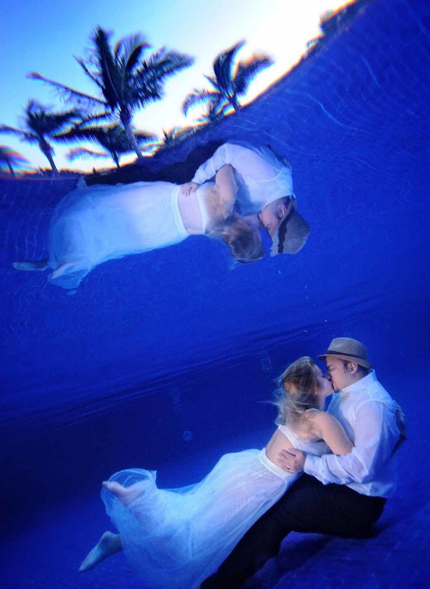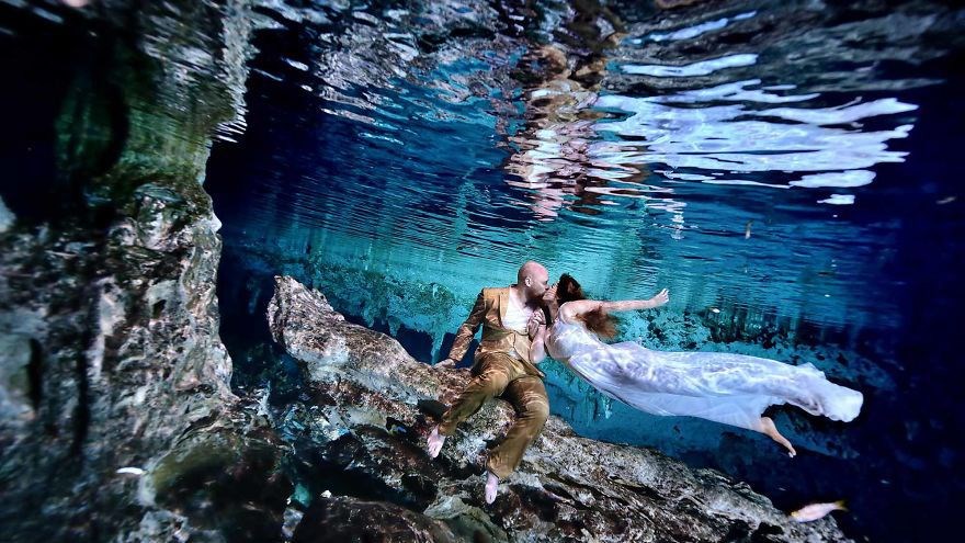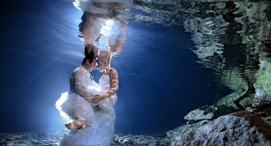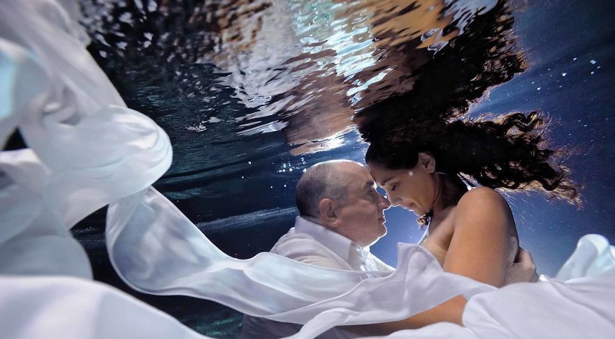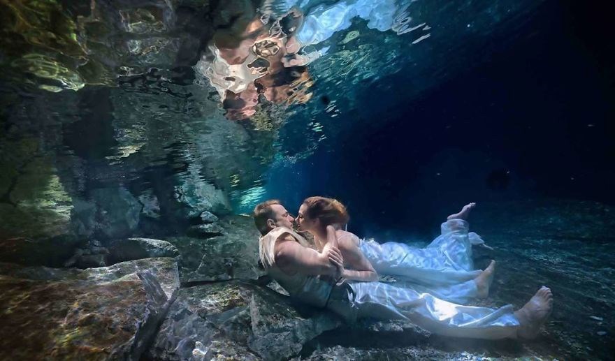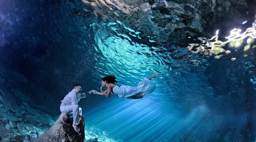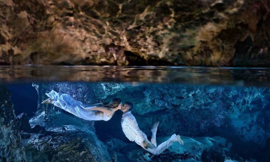 Suyun altında her şey farklılaşır; daha hafif ve daha sessizdir. 10 yıl boyunca suyu zemin olarak kullanan fotoğrafçı Pierre Violle, suyun bu özelliklerinden yararlanarak çiftlerin romantik fotoğraflarını çekiyor. Her bir çiftle üç ila altı saat çalışan Violle, onları rahatlatıp fotoğraf çekiminde olduklarını unutturarak iyi fotoğraflar yakalamayı başarıyor. Çiftleri bazen denizde bazen de havuzda çekiyor. Ancak onun için çekim yapmanın en rahat olduğu yer, Meksika’daki Riviera Maya bölgesi. Burası onun için muhteşem bir ‘su stüdyosu’.