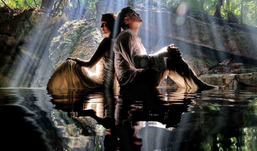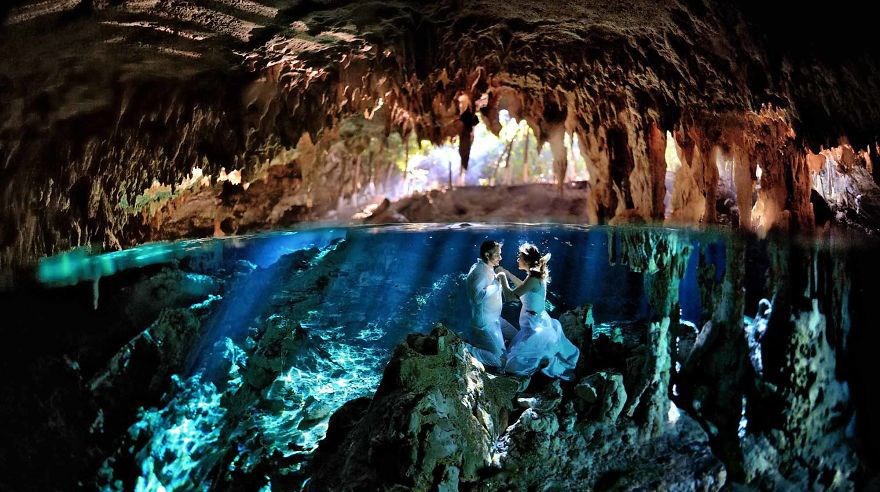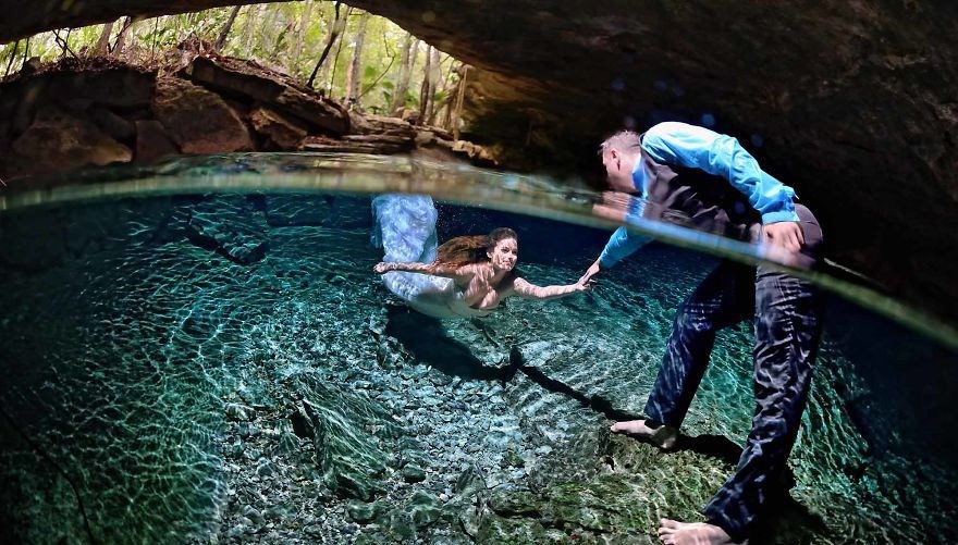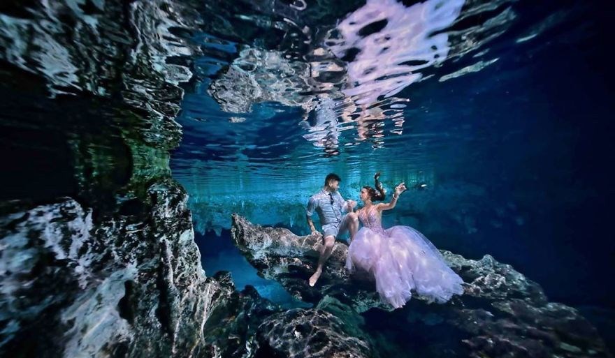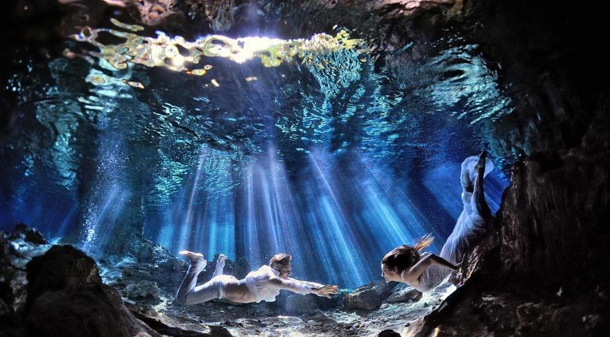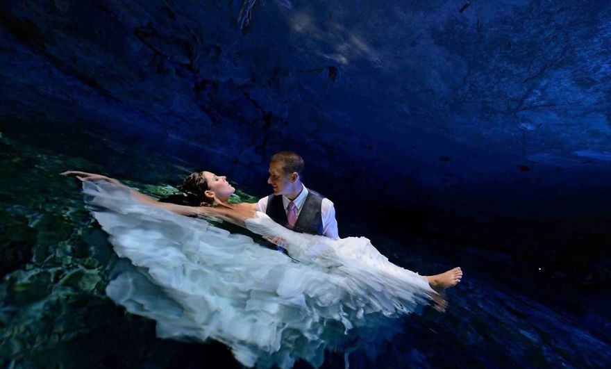 Suyun altında her şey farklılaşır; daha hafif ve daha sessizdir. 10 yıl boyunca suyu zemin olarak kullanan fotoğrafçı Pierre Violle, suyun bu özelliklerinden yararlanarak çiftlerin romantik fotoğraflarını çekiyor. Her bir çiftle üç ila altı saat çalışan Violle, onları rahatlatıp fotoğraf çekiminde olduklarını unutturarak iyi fotoğraflar yakalamayı başarıyor. Çiftleri bazen denizde bazen de havuzda çekiyor. Ancak onun için çekim yapmanın en rahat olduğu yer, Meksika’daki Riviera Maya bölgesi. Burası onun için muhteşem bir ‘su stüdyosu’.