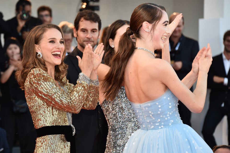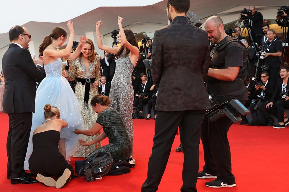 Natalie Portman ve Stacy Martin, Raffey Cassidy’nin elbisesini ayakkabısından kurtarmaya çalıştı.