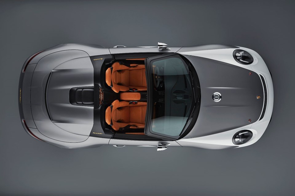 • 911 Speedster Concept modelinin sahip olduğu özellikler arasında daha kısa çerçeve uzunluğuna sahip ve daha eğimli bir ön cam ve buna paralel olarak küçültülmüş yan camlar yer alıyor. Otomobil sahip olduğu alçak flyline ile atalarından olan Porsche 356 1500 Speedster gibi modellerde görmeye alışık olduğumuz o toplu görünüme bürünüyor. 1988 model 911 Speedster’dan bu yana gelenekselleşmiş bir tasarım çizgisi olan “çift bombe” tasarımına sahip ve karbon fiberden yapılmış olan özel arka kapak, devrilme koruma yapısını kaplıyor ve ön koltukların arkasında birleşiyor. ‘Bombelerin’ arasında yer alan kontrast siyah renkteki hava kanatçıkları otomobile aerodinamik bir dokunuş katarken şeffaf Plexiglas rüzgâr önleyiciye işlenmiş olan ‘Porsche 70 yaşında’ logosu ise markanın geçmişini ön plana çıkarıyor.
