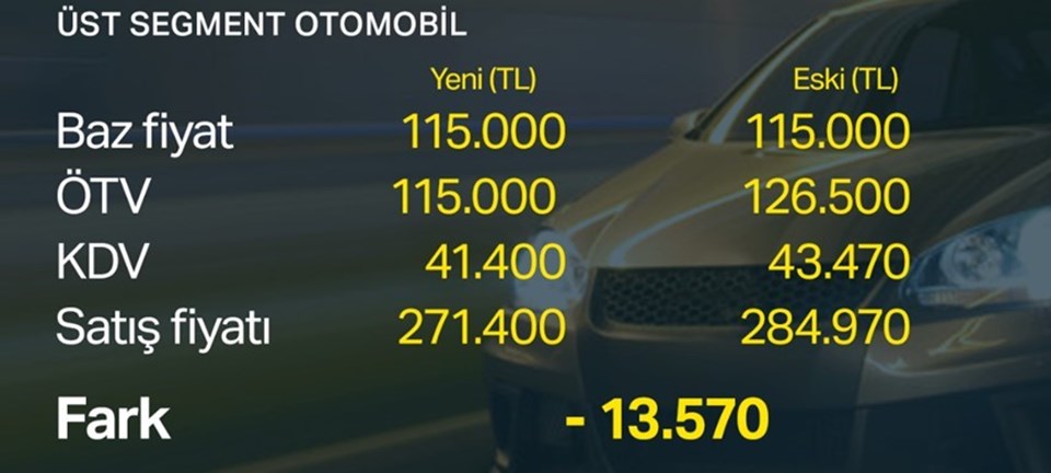 Matrahı 70 bin TL’yi aşmayan araçlar için ÖTV yüzde 45 (Eski rakam 46 bin TL), 70 bin lirayı aşıp 120 bin lirayı aşmayanların yüzde 50 (Eski rakam 80 bin TL), matrahı 120 bin TL’yi aşan 1.6 litre ve altı araçlarda ise ÖTV yüzde 60 olacak şekilde belirlendi.