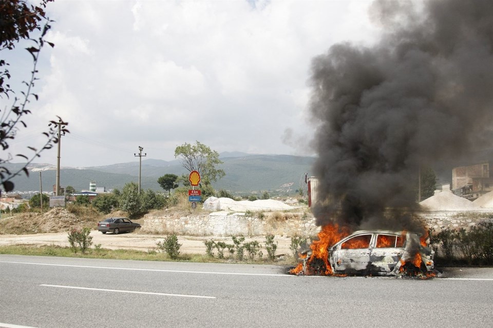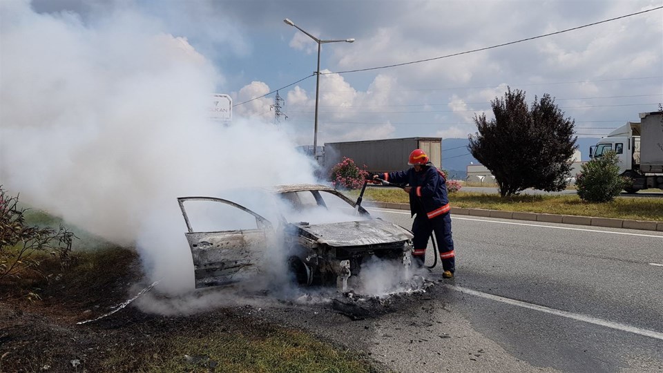 Bursa’nın Orhangazi ilçesinde, seyir halinde arızalanan ve aniden alev alan otomobil, tamamen yandı.