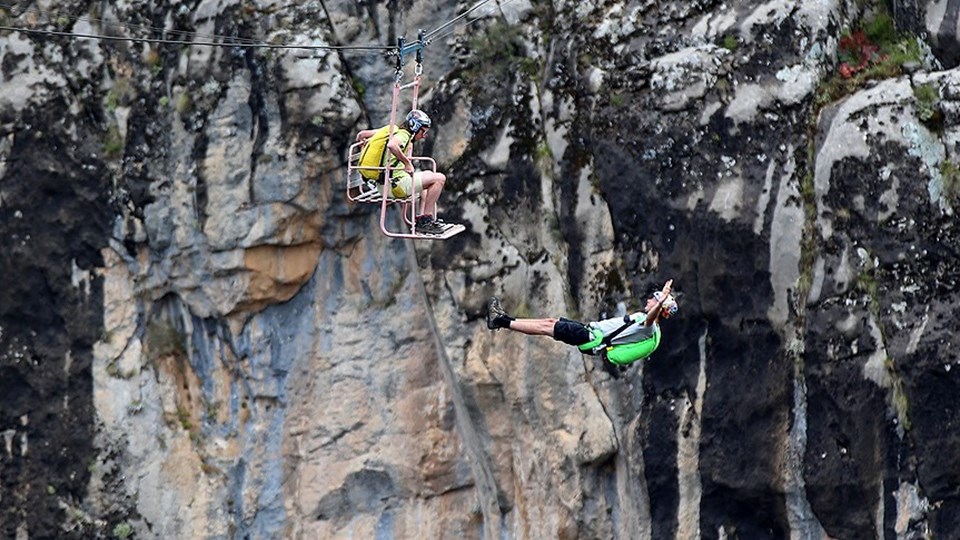 Erzincan‚ın Kemaliye ilçesinde düzenlenen 39. Uluslararası Kültür ve Doğa Sporları Festivali kapsamında, adrenalin tutkunu sporcular, 500 metre yükseklikten atladıkları Karanlık Kanyon‚da taş, kağıt, makas oynayarak paraşüt açtı.