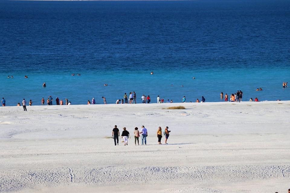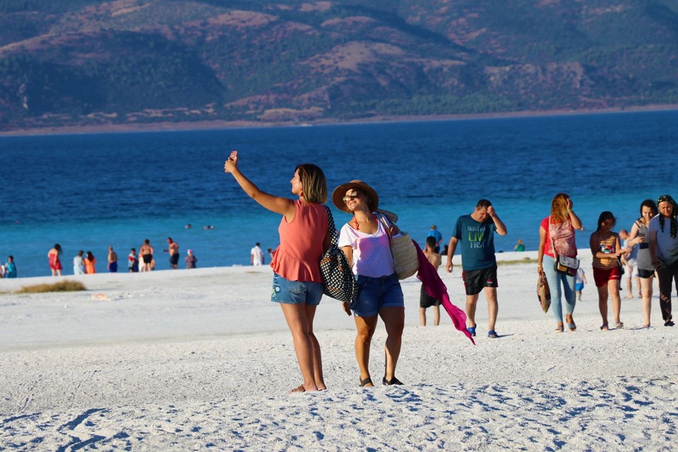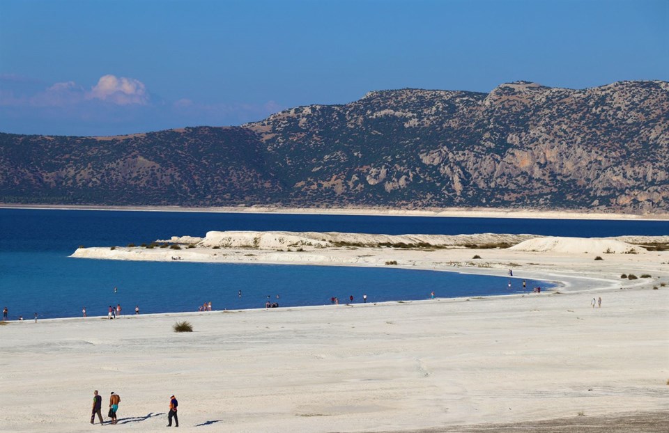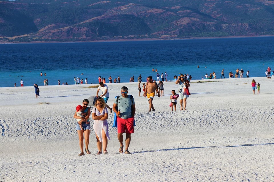 Burdur’un Yeşilova ilçesinde bulunan, beyaz kumsalı ve suyunun berraklığıyla Maldiv Adaları’na benzetilen Salda Gölü’nde hafta sonları ziyaretçi yoğunluğu yaşanıyor.