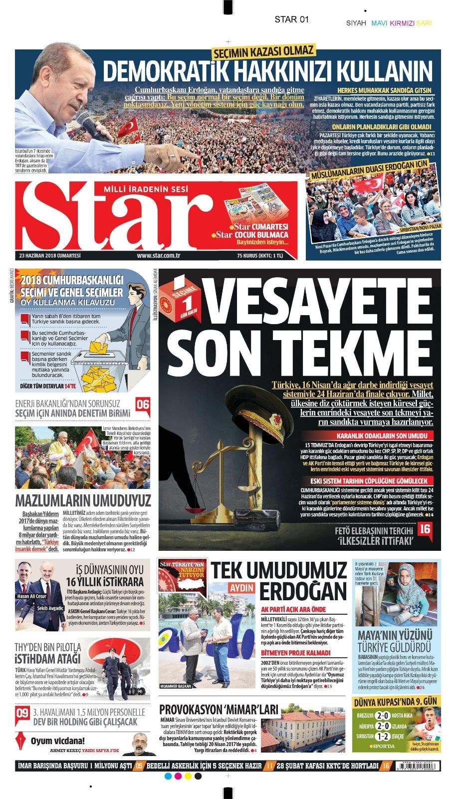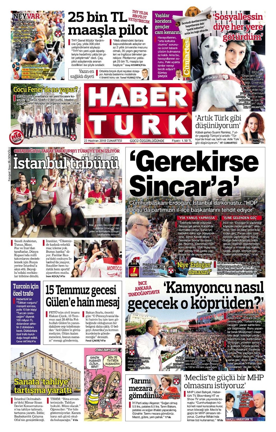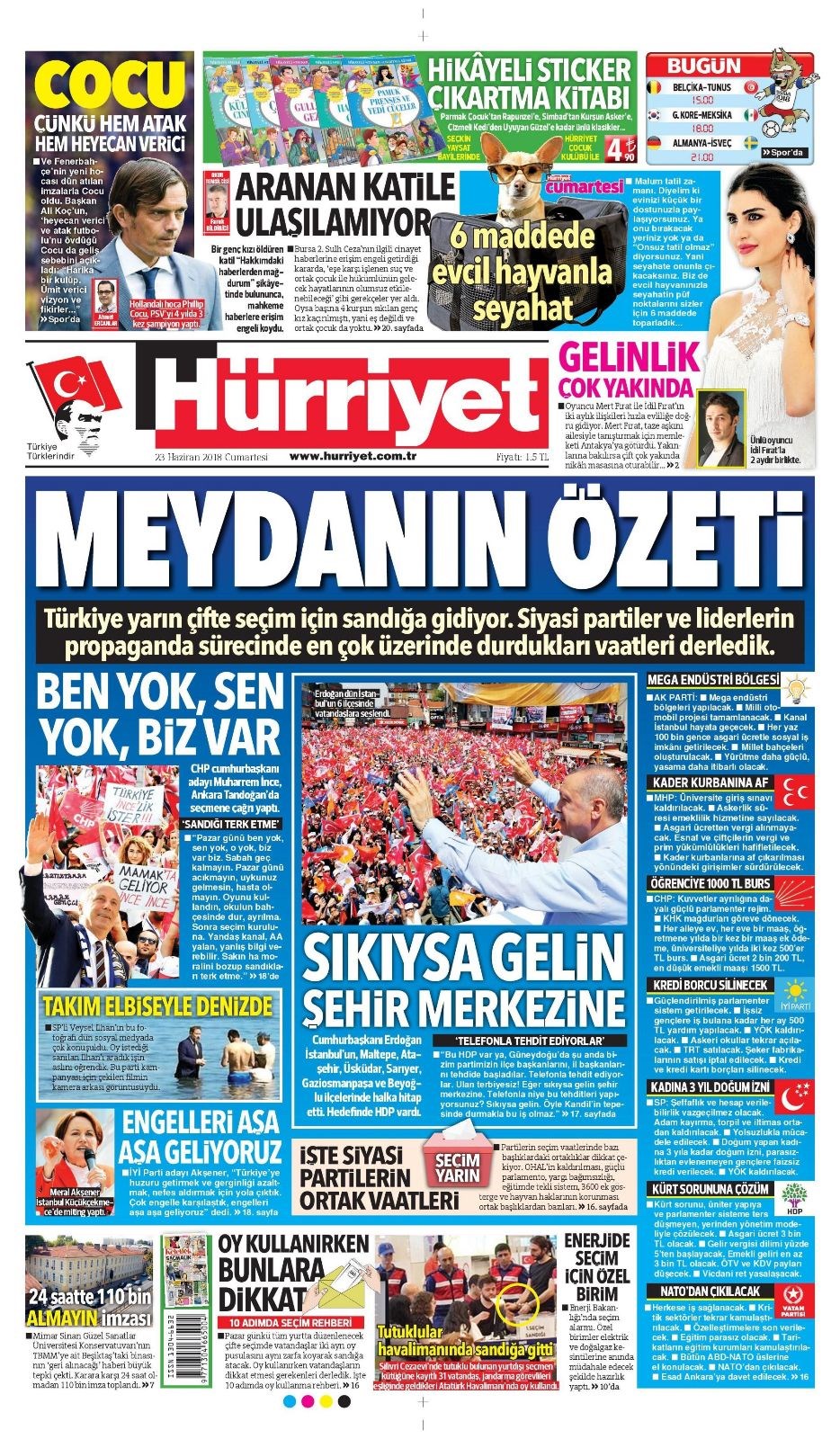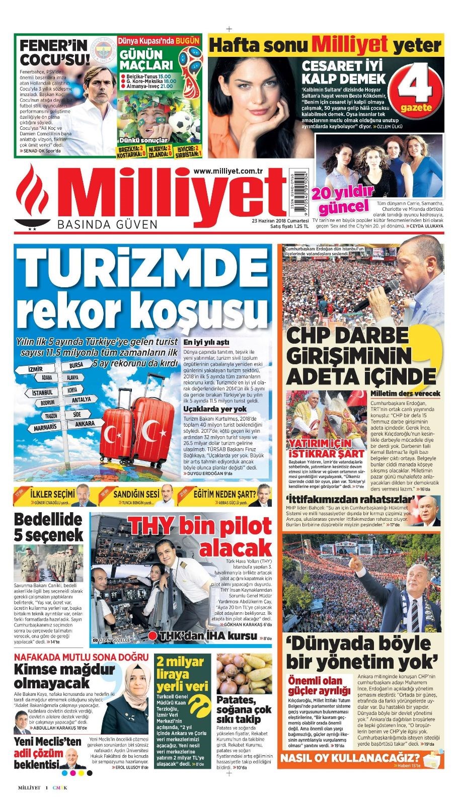 “Bugünkü gazete manşetlerinde neler var? Gazeteler Türkiye ve dünya gündemine ilişkin bugün hangi manşetleri attı? Hangi haberler gazete manşetlerinde geniş yer buldu? Gazetelerin birinci sayfalarında neler var? 23 Haziran 2018 tarihli Milliyet, Hürriyet, Habertürk, Vatan, Türkiye, Takvim, Star, Sözcü, Sabah, Posta, Dünya, Cumhuriyet, Aydınlık, Akşam, Yeni Akit, Yenibirlik, Yeni Şafak, AMK, Fotomaç, Fanatik gazetelerinin manşetlerini okuyun.”