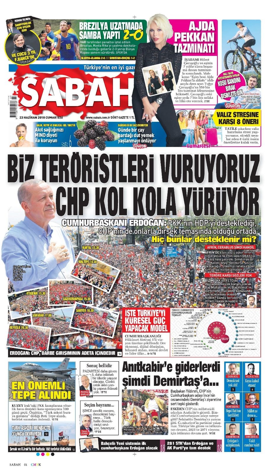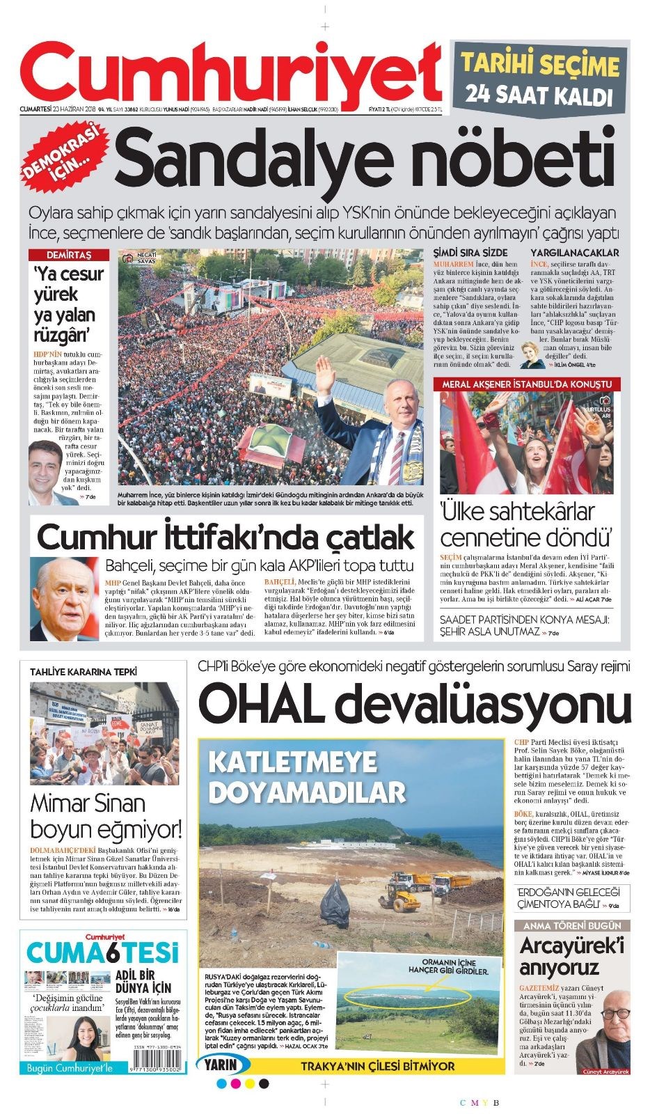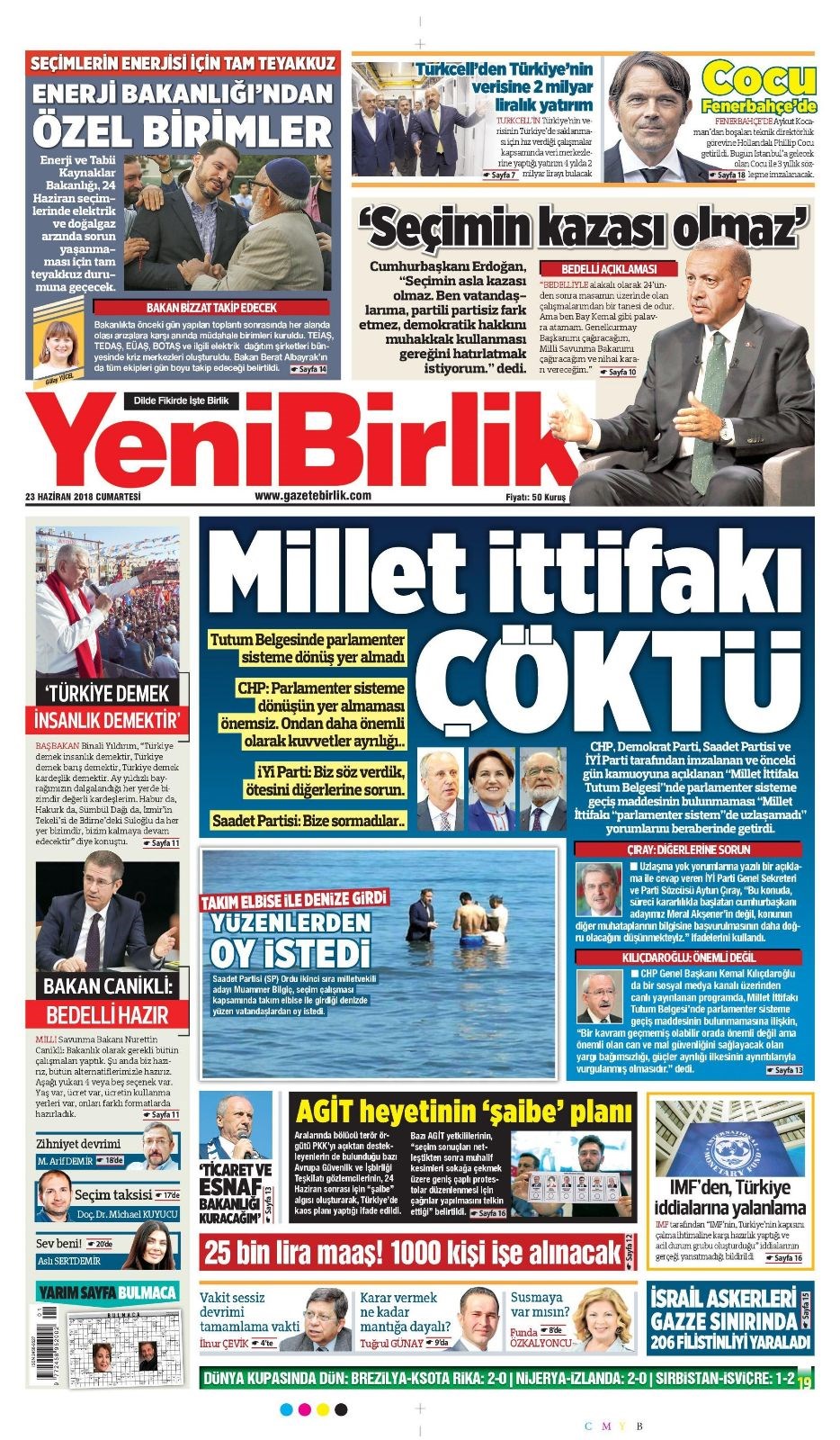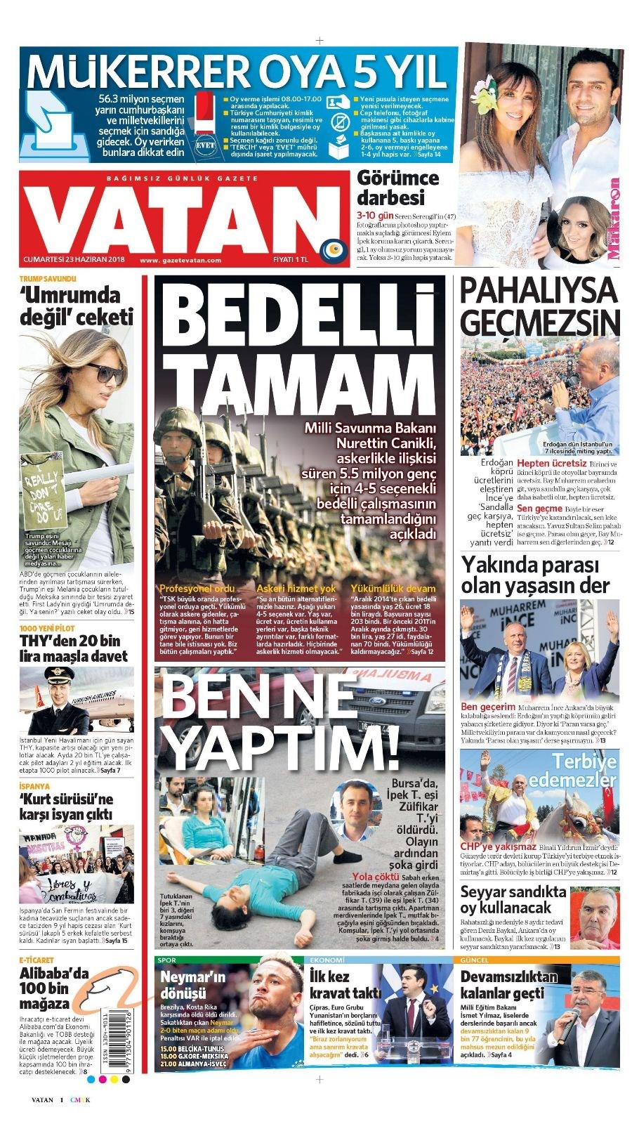 “Bugünkü gazete manşetlerinde neler var? Gazeteler Türkiye ve dünya gündemine ilişkin bugün hangi manşetleri attı? Hangi haberler gazete manşetlerinde geniş yer buldu? Gazetelerin birinci sayfalarında neler var? 23 Haziran 2018 tarihli Milliyet, Hürriyet, Habertürk, Vatan, Türkiye, Takvim, Star, Sözcü, Sabah, Posta, Dünya, Cumhuriyet, Aydınlık, Akşam, Yeni Akit, Yenibirlik, Yeni Şafak, AMK, Fotomaç, Fanatik gazetelerinin manşetlerini okuyun.”