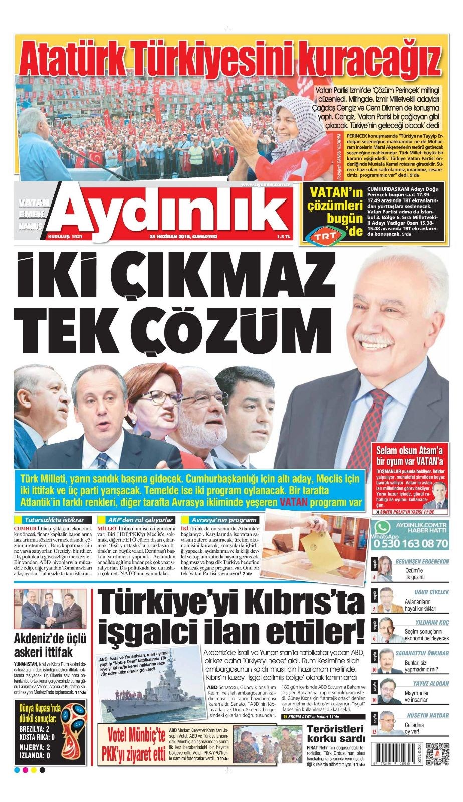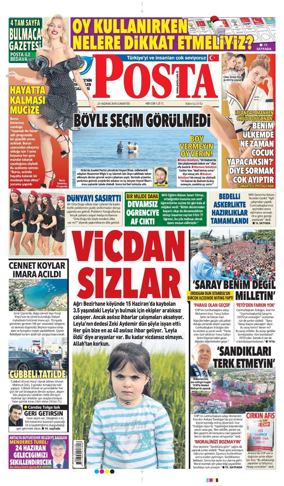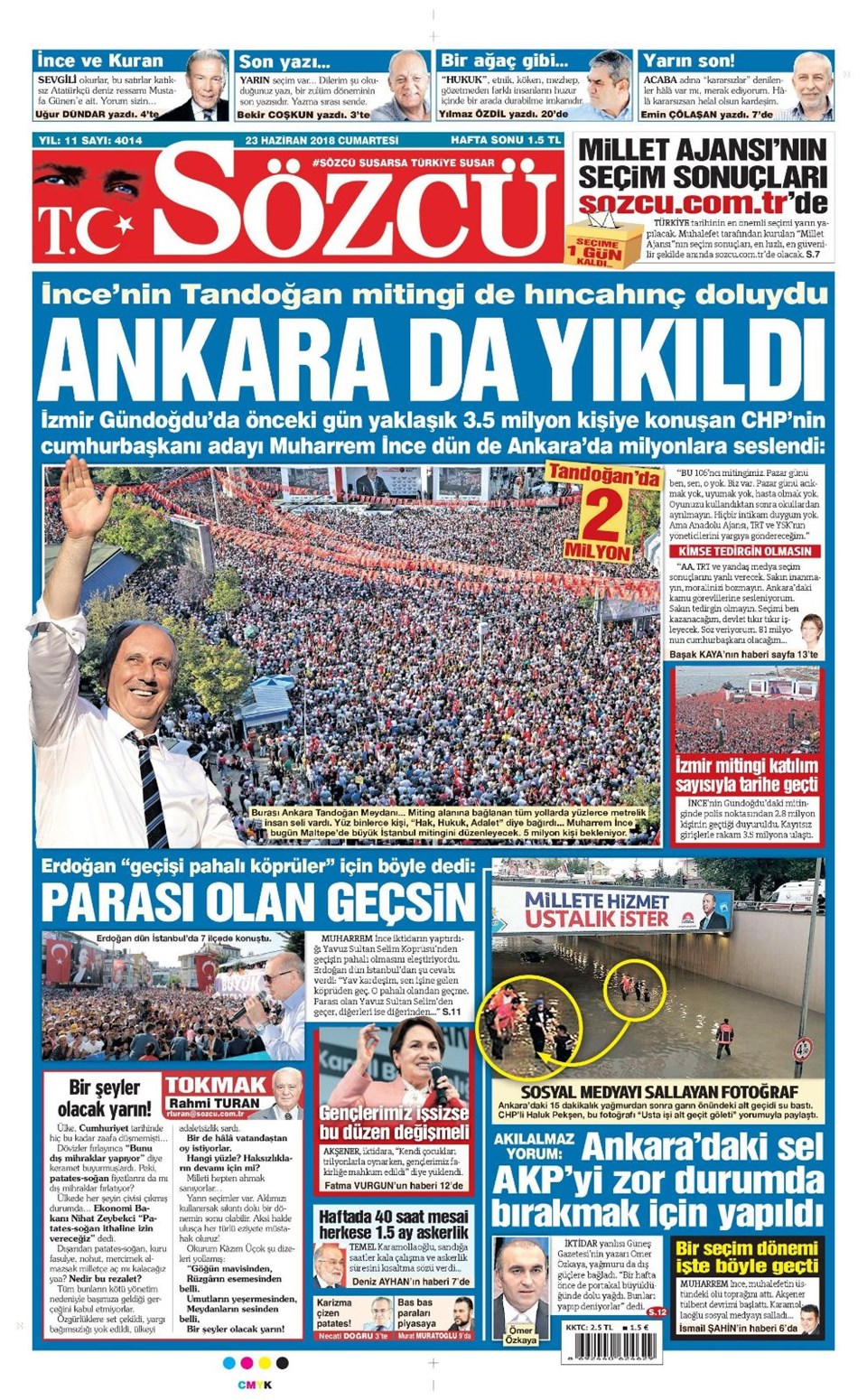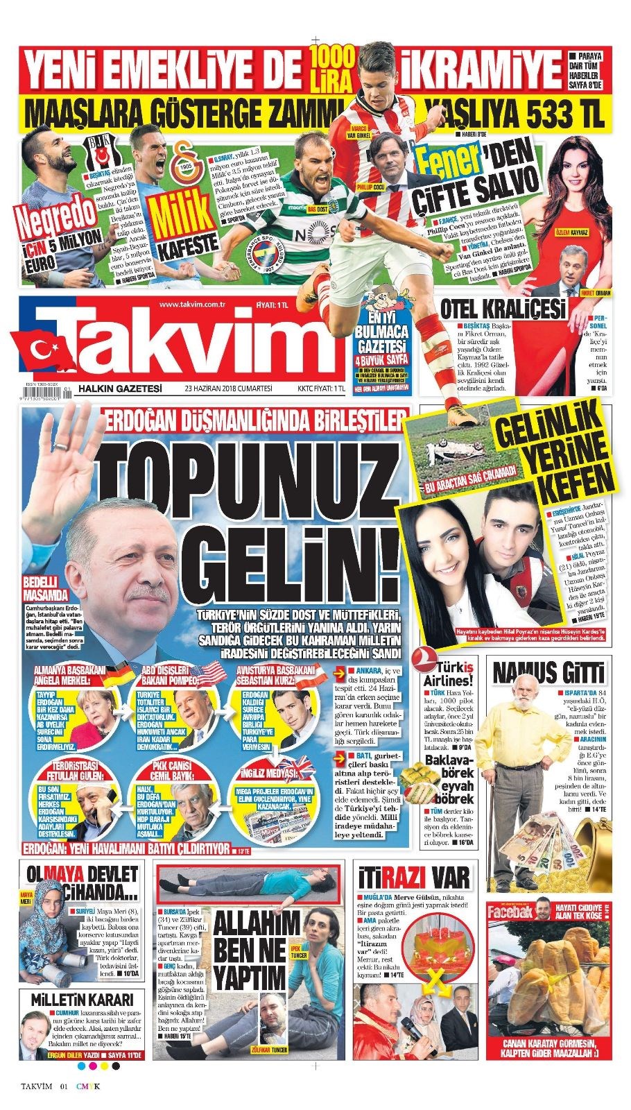 “Bugünkü gazete manşetlerinde neler var? Gazeteler Türkiye ve dünya gündemine ilişkin bugün hangi manşetleri attı? Hangi haberler gazete manşetlerinde geniş yer buldu? Gazetelerin birinci sayfalarında neler var? 23 Haziran 2018 tarihli Milliyet, Hürriyet, Habertürk, Vatan, Türkiye, Takvim, Star, Sözcü, Sabah, Posta, Dünya, Cumhuriyet, Aydınlık, Akşam, Yeni Akit, Yenibirlik, Yeni Şafak, AMK, Fotomaç, Fanatik gazetelerinin manşetlerini okuyun.”