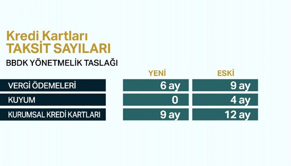 Bu arada „Banka Kartları ve Kredi Kartları Hakkında Yönetmelik“te yapılan değişiklik kapsamında, mal ve hizmet alımları ile nakit çekimlerinde taksitlendirme süresi 9 aydan 12 aya çıkarıldı. Kuyum harcamalarında ise daha önce 4 ay olarak belirlenen taksitlendirme süresi sıfıra düşürüldü.