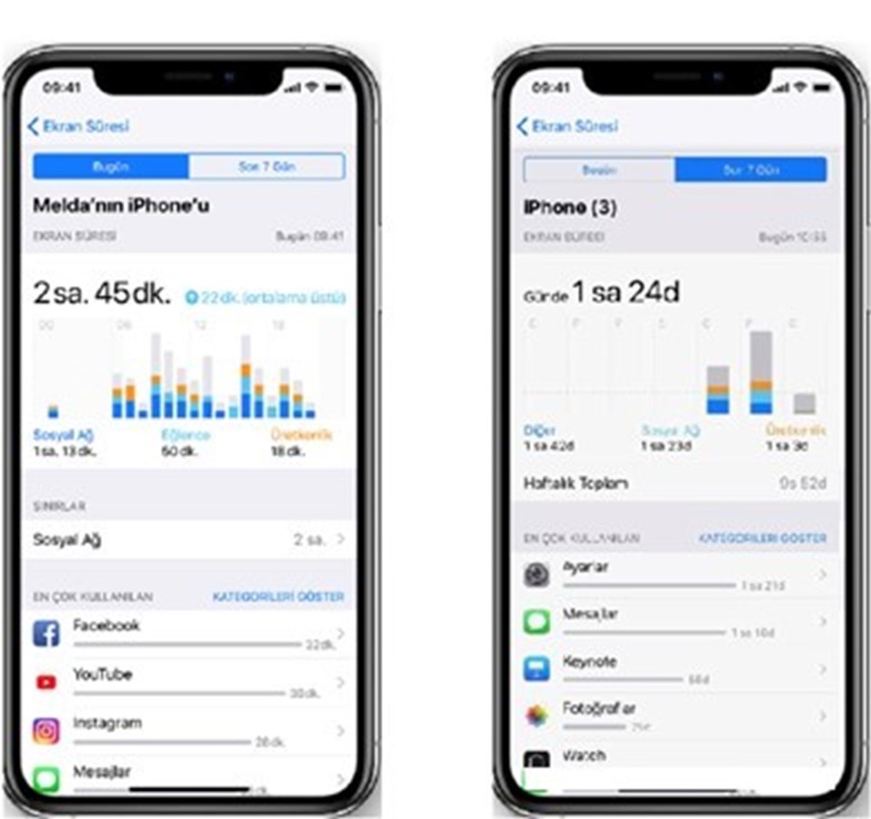 Ebeveynler Ekran Süresi özelliği ile haftalık kullanım raporları alabiliyor veya belirli bir uygulamanın ne kadar kullanıldığını, alınan bildirimleri ve cihazların kullanılma sıklığını görebiliyorlar.