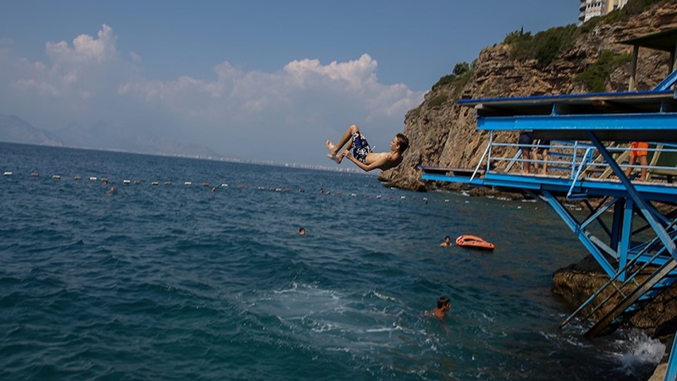 Asansörle veya merdivenlerle plaja ulaşan ziyaretçiler, metrelerce yükseklikten atlayarak kendilerini Akdeniz’in serin sularına bırakma imkanı da buluyor.