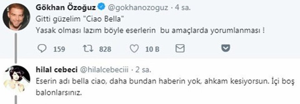 Gökhan Özoğuz, twitter hesabından, “Gitti güzelim Ciao Bella. Böyle eserlerin bu amaçlarda yorumlanmasının yasak olması lazım” mesajını yazdı.