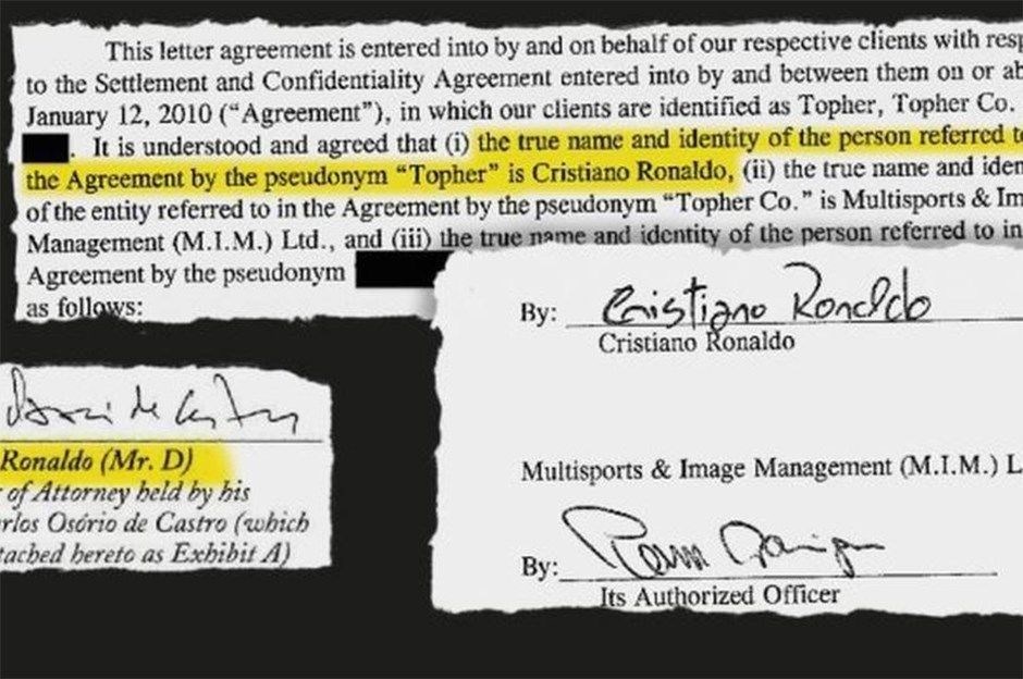 Alman Der Spiegel dergisi, Ronaldo ile Mayorga arasında imzalanan 375 bin dolarlık sus payı belgesini yayınlamış, belge, dava sürecinde Ronaldo’yı köşeye sıkıştıracak bir delil olarak yorumlanmıştı.