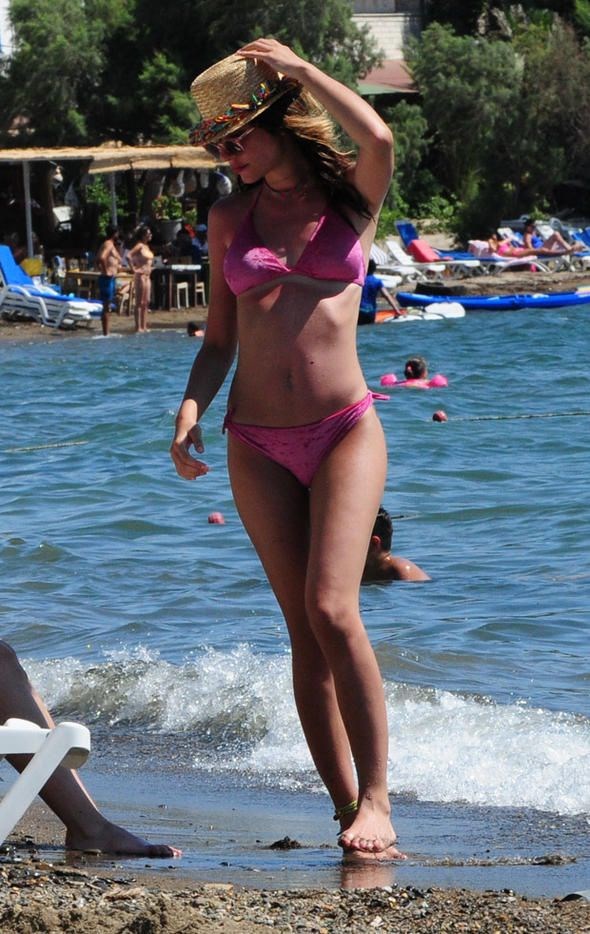 Sahile çıkarken mayolu görüntülenmemek için şort giyen ünlü model, muhabirlere “Artık bikinili çektiğiniz yeter” diye takıldı.