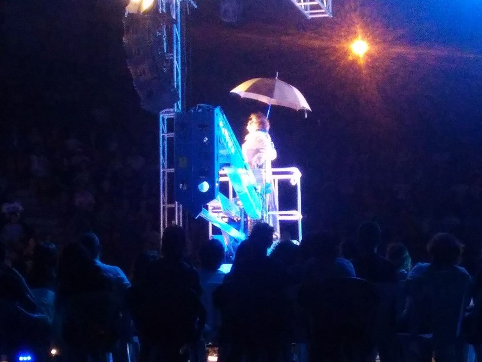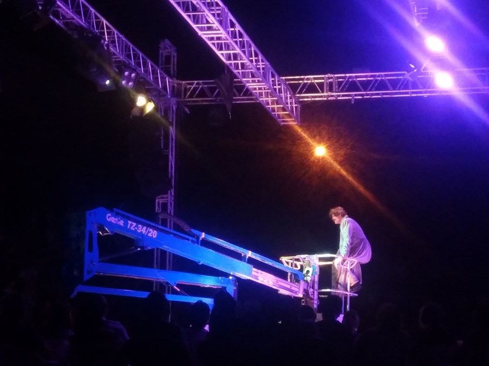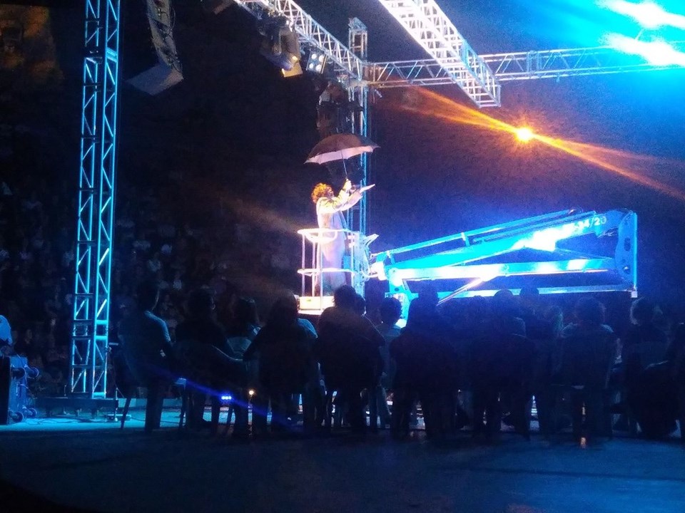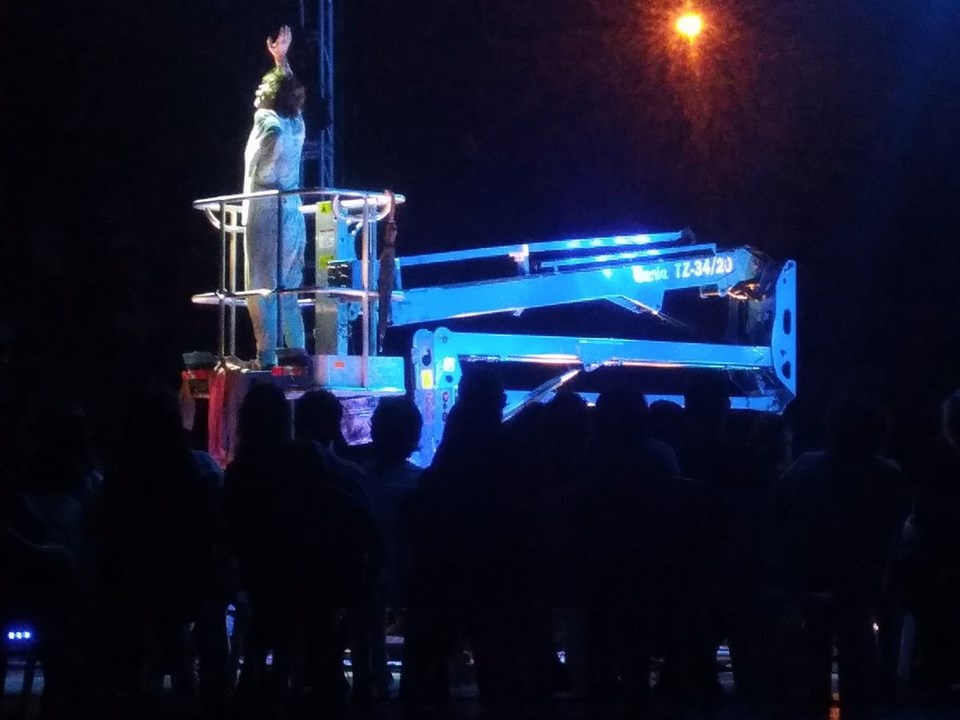 • Beşikçioğlu, sahneye kurulan vince takılı sepette oyunu sergiledi.
