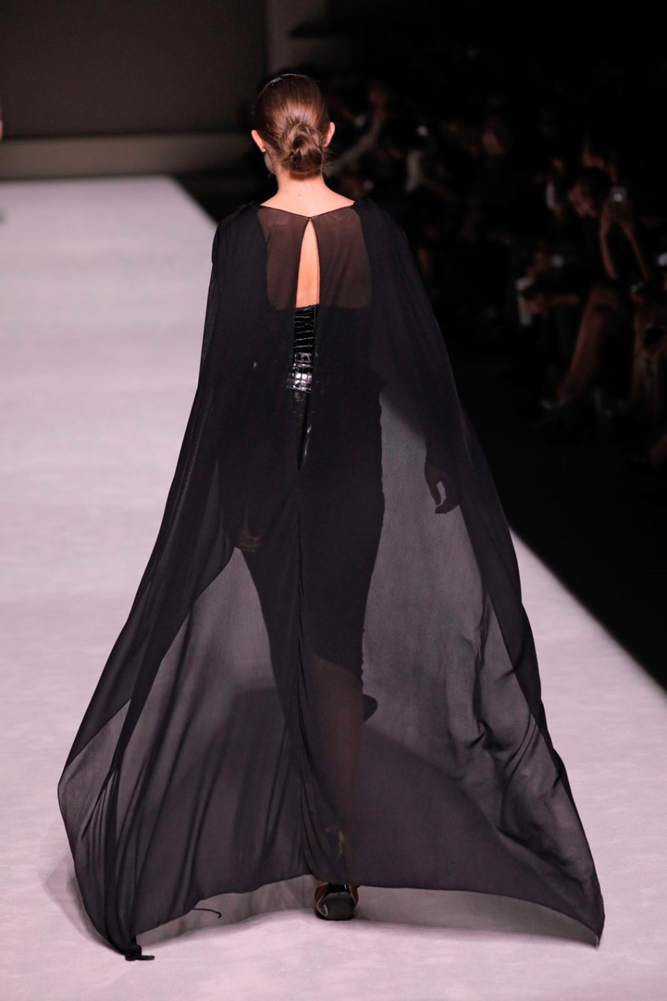Hadid, defilede siyah bir elbise ve gold ayakkabı ile yürüdü.