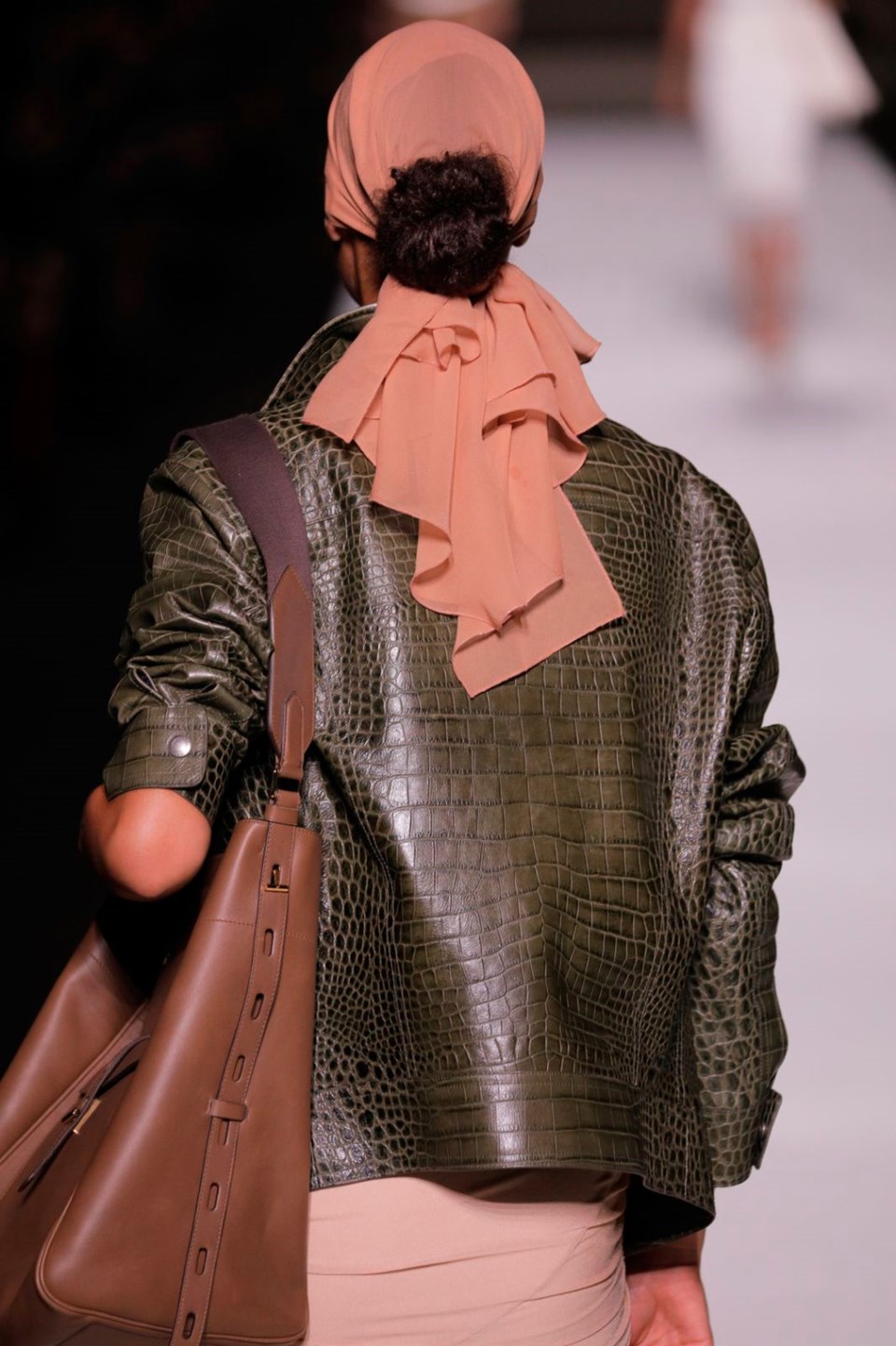 Gerber, mor renkli deri ceket ve eşarpla tamamlanmış bir elbiseyle podyuma çıktı.