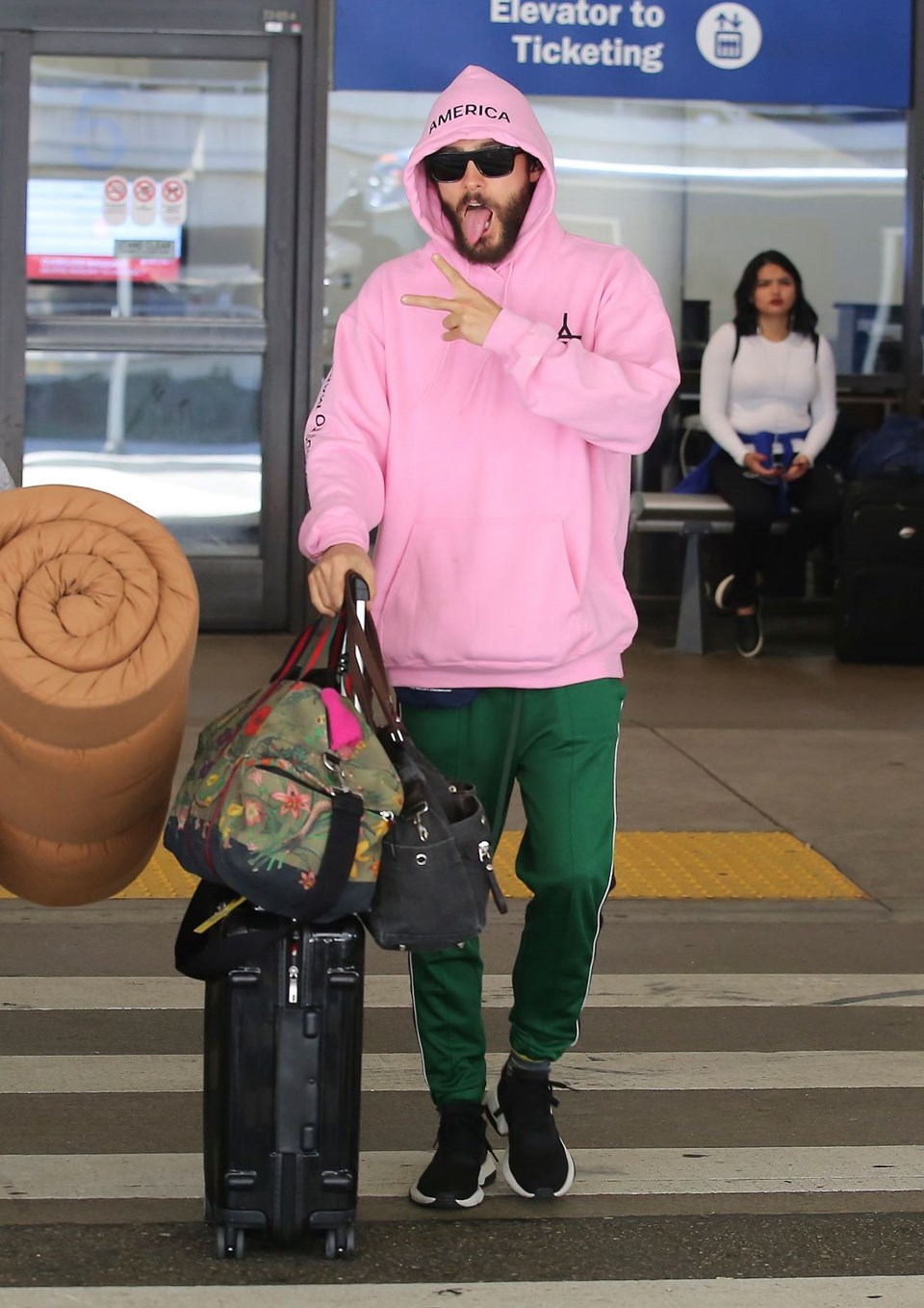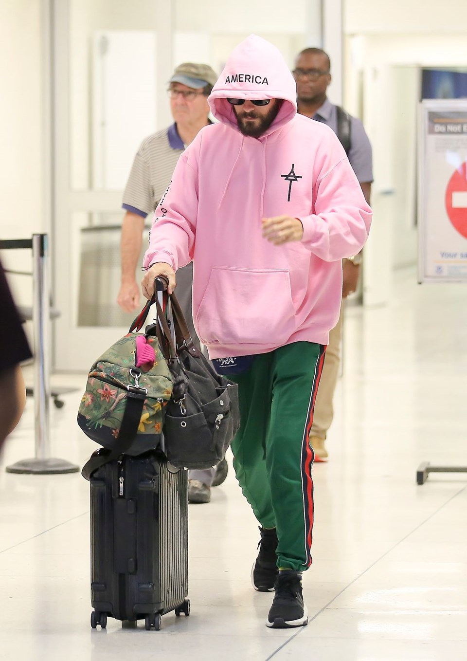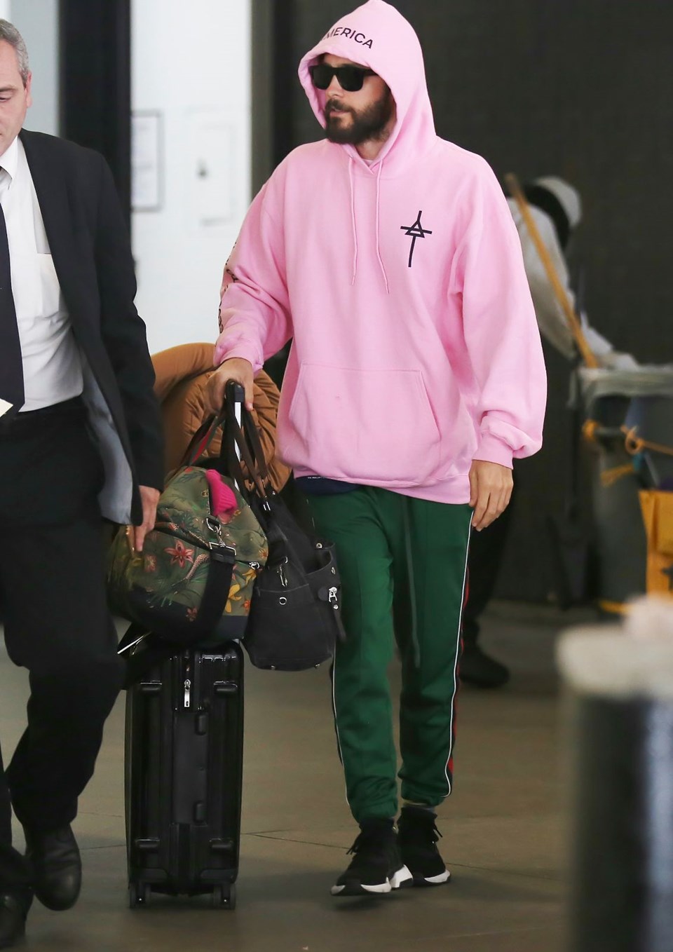 Los Angeles Uluslararası Havaalanı’nda göz alıcı bir pembe kapüşonluyla objektiflere takılan Leto’nun asıl sürprizi kıyafetinin sırtında gizliydi.