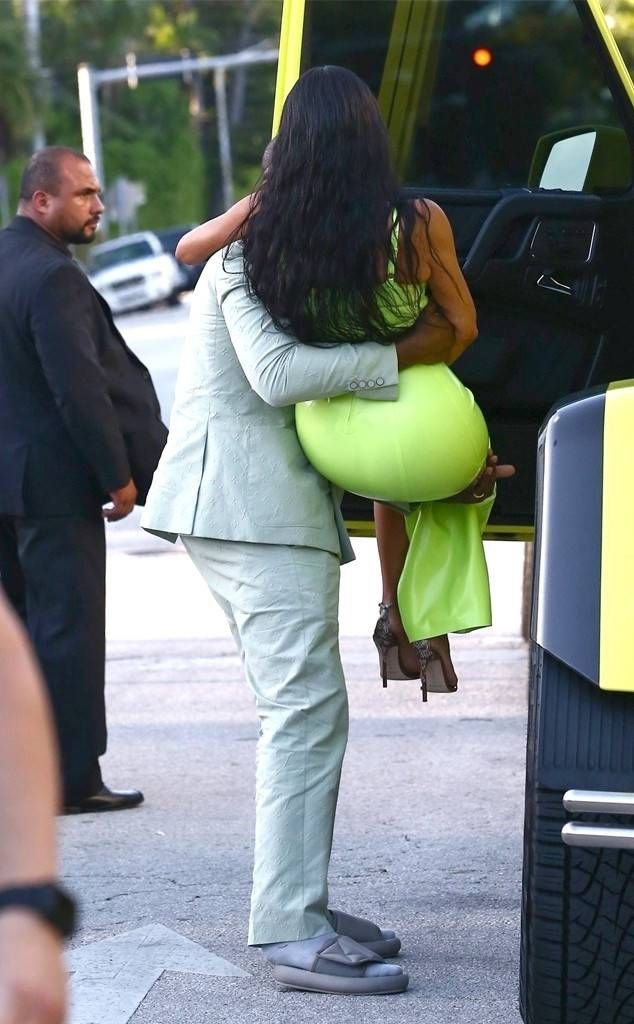• Kim fosforlu yeşil bir elbise giyerken, Kanye de yeşil Louis Vuitton bir takım tercih etti.