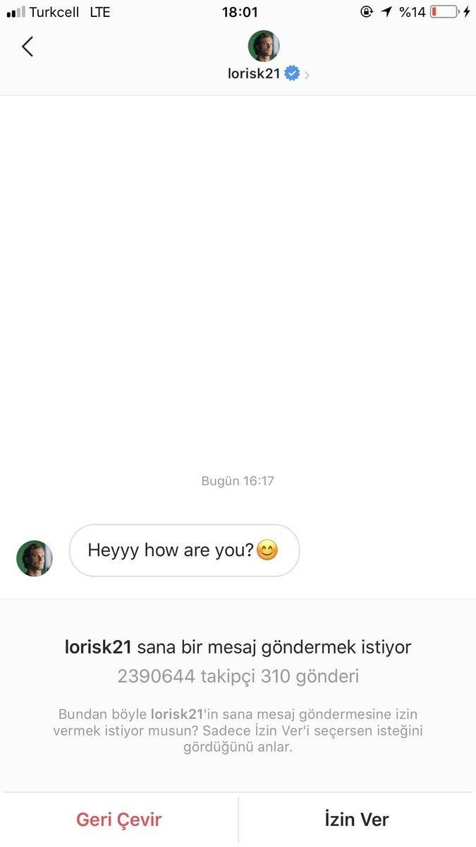 Beşiktaş’ın Liverpool’dan transfer ettiği Alman kaleci Loris Karius, Instagram’dan Melis Ayça Değirmencioğlu’na DM’den (Direk mesaj) mesaj gönderdi. -