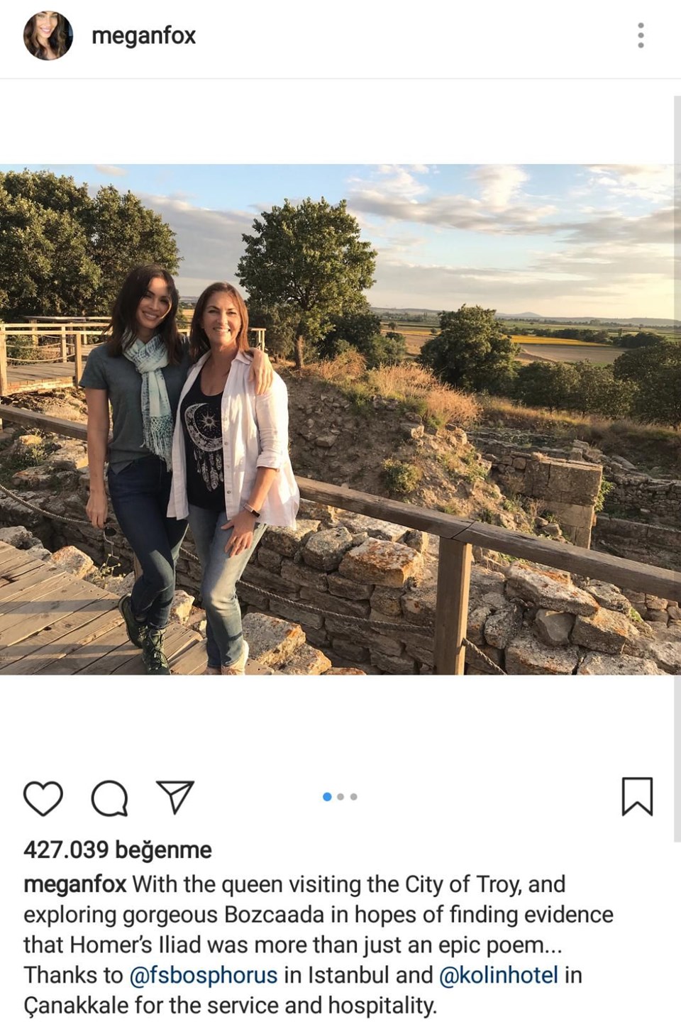 Los Angeles merkezli, Türkiye’de faaliyet gösteren Karga7 Pictures’in yapımcılığını üstlendiği ve Travel Channel ekranlarında gelecek aylarda yayınlanacak mitolojik efsaneleri konu alan „Myths&Mysteries with Megan Fox“ isimli belgeselin çekimleri için Türkiye’ye gelen Hollywood yıldızı, ABD’li oyuncu Megan Fox, Troya Ören Yeri’ndeki çekimlere de katılmıştı.