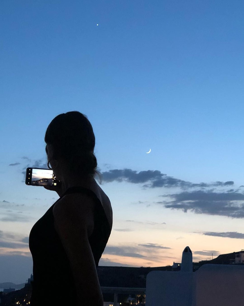 Gülse Birsel„Yaz tatillerinde böyle havalı tavırlarım oluyor. Ama bu kadarı senede bir denk gelir, bakınca kendimden etkilendim, o denli. Hasibe Eren yakalayıp çekmiş. Günbatımının doğal hali, filtre miltre yok, bam bam bam!“