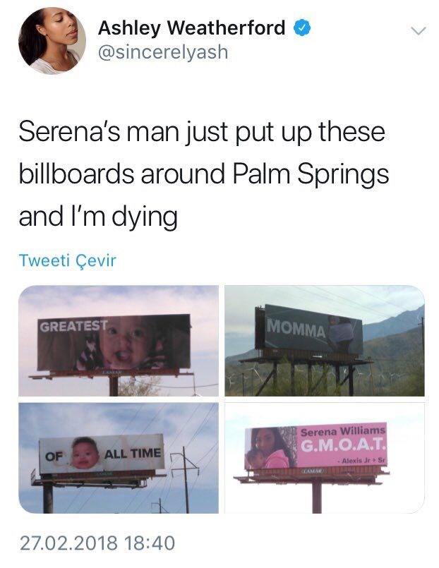 Bu, Ohanian’ın Williams’a yaptığı ilk romantik sürpriz değil. Williams, Eylül ayında dünyaya gelen kızlarıyla vakit geçirebilmek için tenis kortlarına bir süreliğine ara vermişti. Şubat ayında işe geri dönmeye karar verdiğinde, Ohanian üzerlerine “Dünyanın en iyi annesi” yazdırıp kızlarının fotoğraflarıyla süslediği 4 tane billboard’u Palm Springs yolu boyunca gösterilmek üzere kiralayarak başka bir jeste daha imza atmıştı.