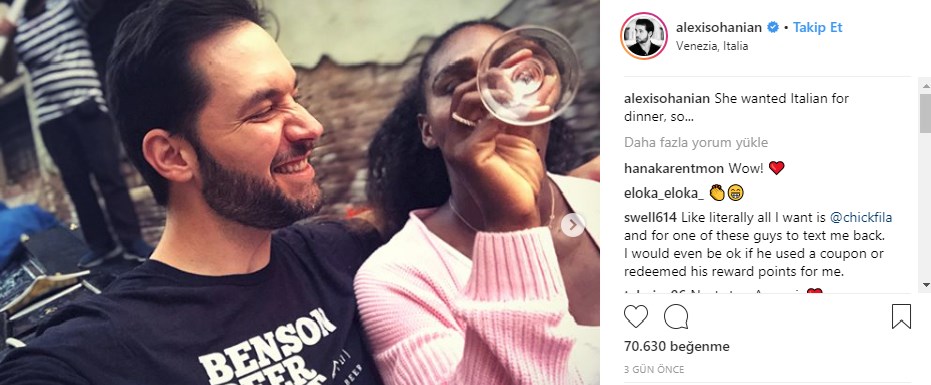 Geçtiğimiz cumartesi gününü İtalya’nın Venedik kentinde geçiren çiftin gezi sebebi, Ohanian’ın yaptığı Instagram paylaşımı sonrası belli oldu. Birlikte Venedik’te çekilmiş oldukları fotoğrafın altına Williams’ı kastederek, “Canı İtalyan yemeği istedi, böylece…” notunu düşen Ohanian, eşine yaptığı jestle birçok güzel yorum aldı.