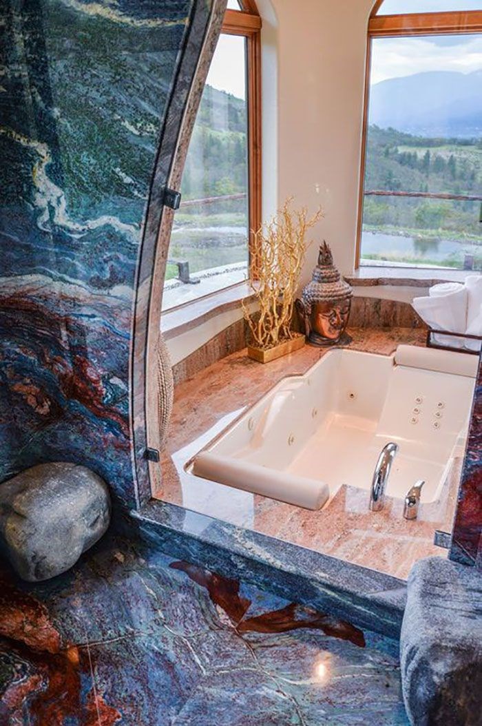 Banyo, mavi, Van Gogh resmi esintili granitlerle dekore edilmiş.